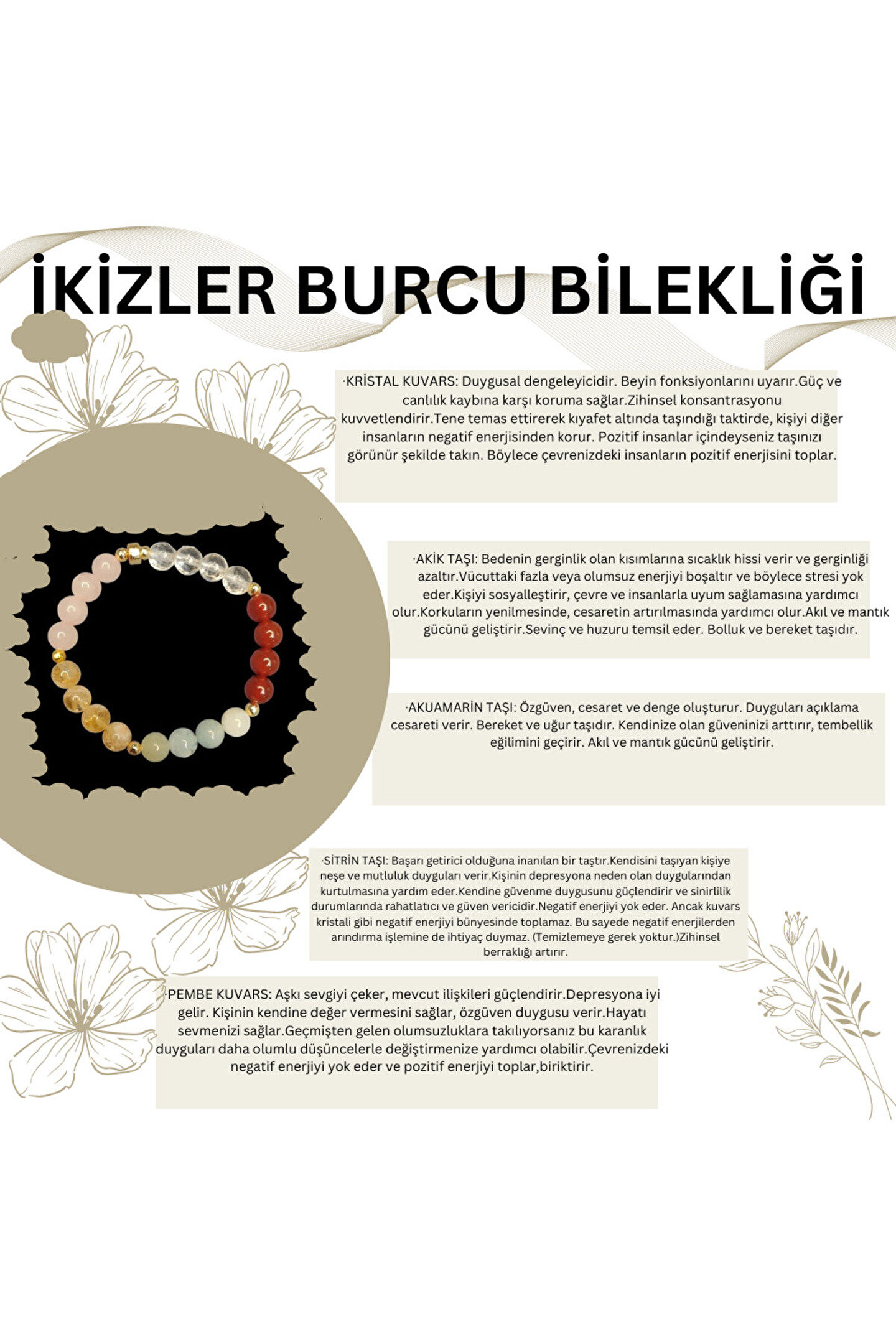 Doğal taş kullanımı sayesinde her bir bileklik, benzersiz ve otantik bir görünüm sunar; İkizler burcu bileklik, hem şıklığı hem de anlamı bir arada barındırarak kişisel tarzınıza eşsiz bir dokunuş katar; Doğal taş materyali ile hem dayanıklılık hem de estetik bir parlaklık sağlar, uzun süreli kullanım için idealdir; Her bileklik, farklı renk ve desenlerdeki doğal taşlarla tasarlanmıştır; bu sayede her kombininize uyum sağlayacak çeşitlilikte seçenekler sunar;