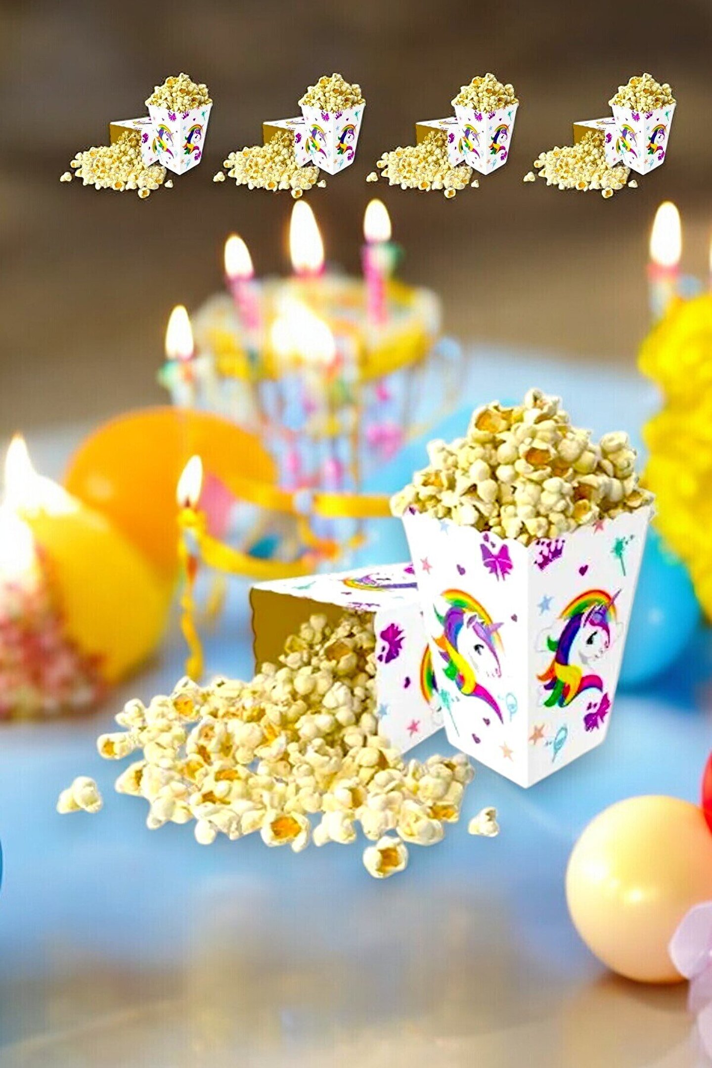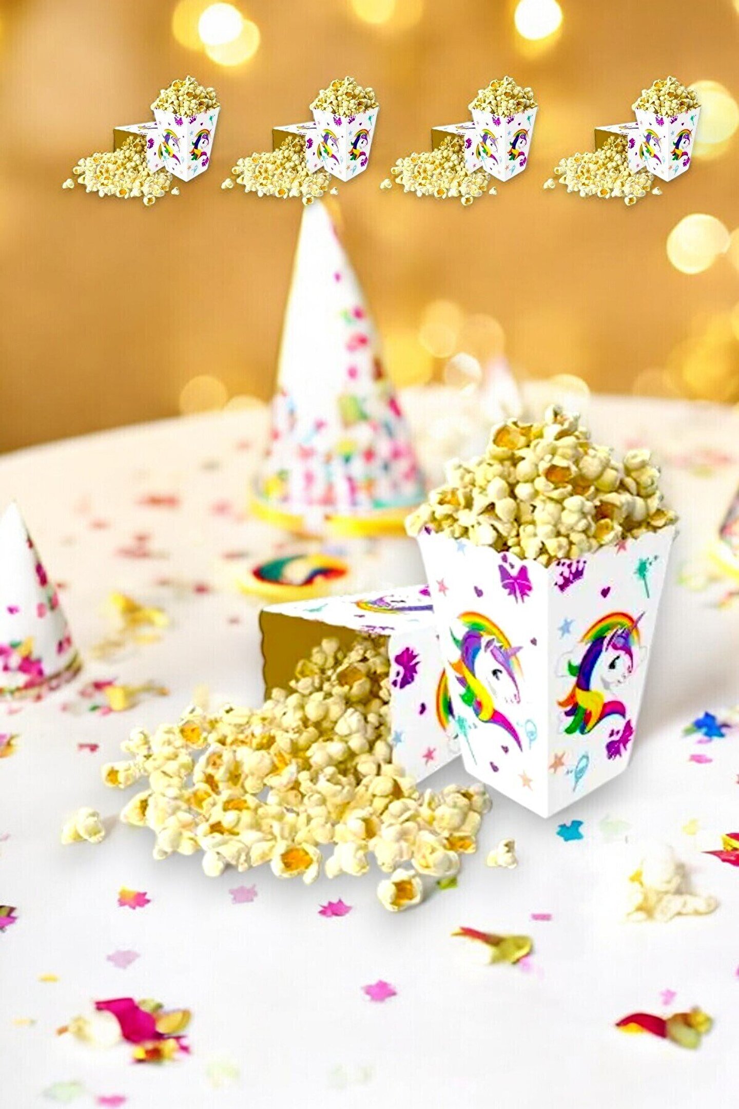 Unicorn temalı 8 adet mısır kutusu ile partinize sihirli bir dokunuş ekleyin! Renkli ve eğlenceli tasarımlara sahip bu kutular, özellikle unicorn temalı doğum günü partileri ve çocuk etkinlikleri için mükemmel bir seçimdir. Dayanıklı kartondan üretilen kutular, popcorn, çerez, şekerleme ve diğer atıştırmalıklar için idealdir. Unicorn’un büyüleyici dünyasını yansıtan pastel tonlar ve zarif detaylarla tasarlanmış bu mısır kutuları, partinize neşe katacak.;Ürün Özellikleri:;Adet Sayısı:8 adet;Tema:Unicorn;Malzeme:Dayanıklı karton;Kullanım Alanları:Doğum günleri, temalı etkinlikler, çocuk partileri;Renkler:Pastel tonlarda unicorn desenleri;Boyut:İdeal atıştırmalık kutusu boyutunda;Kullanım Kolaylığı:Katlanabilir ve kullanıma hazır;Unicorn temalı mısır kutuları, parti masalarınızı renklendirir ve ikramlarınıza büyülü bir hava katar. Diğer unicorn temalı ürünlerle birlikte kullanarak tam bir konsept yaratabilirsiniz!;Ürünlerin tasarımları fotoğraflardakilere göre değişkenlik gösterebilir. Ürün konusu değişmez sadece tasarım değişebilir.