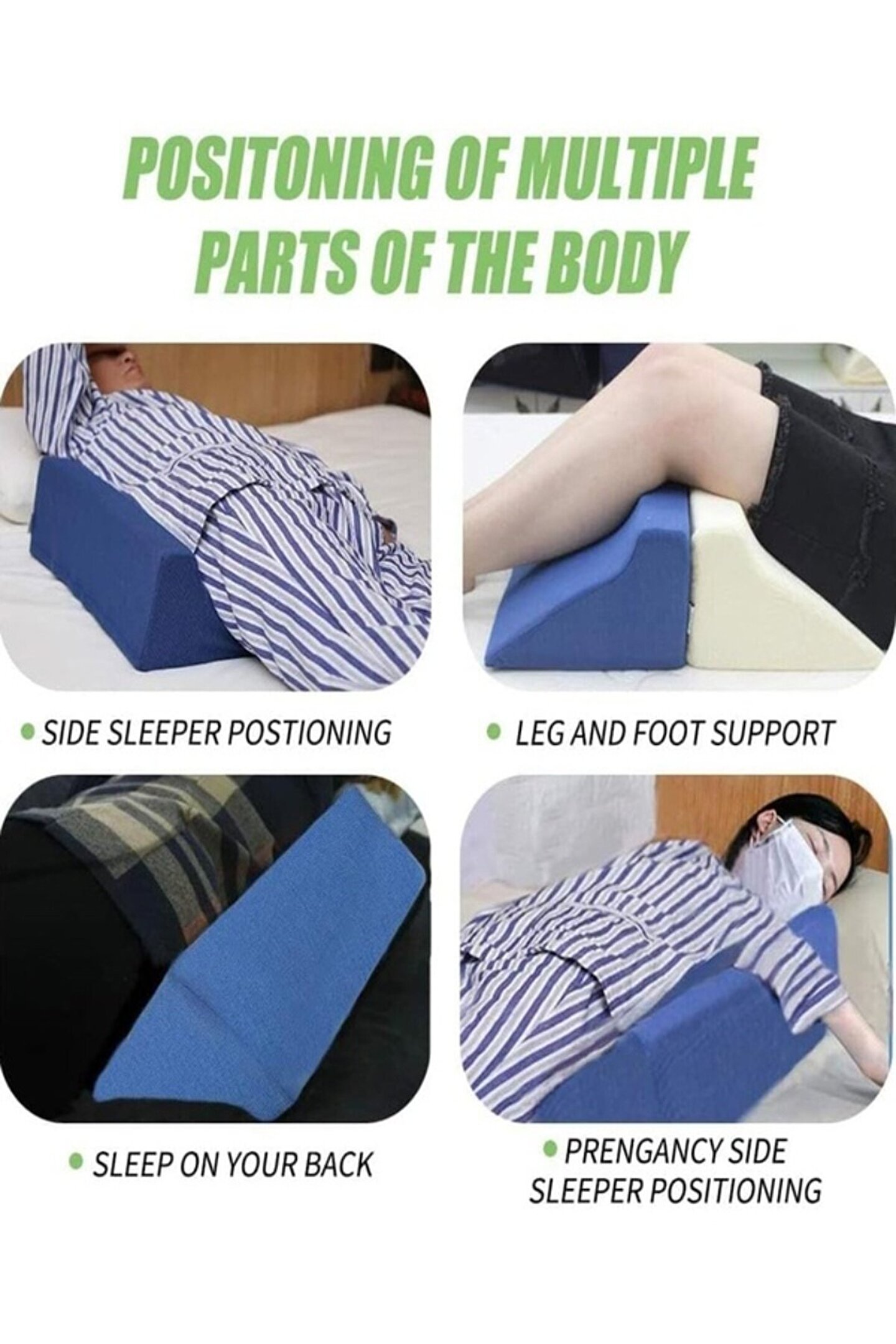 Bu bir evde bakım yardımı tedavi yastığıdır. Hastaların dönmesine, duruşlarını değiştirmesine, bacak pasif kaldırmasına yardımcı olabilir, bacak kan dolaşımını iyileştirmesine yardımcı olabilir; Aynı zamanda hamile kadınların karnını desteklemeye ve hamile kadınların uyuması için iyi bir ortam yaratmaya yardımcı olur. Dik açı boynunuzu rahatlatmaya yardımcı olur, asit reflüsüne, zayıf kan dolaşımına, alerjilere veya sırtüstü pozisyonda nefes almayı engelleyebilecek diğer durumlara iyi gelir.