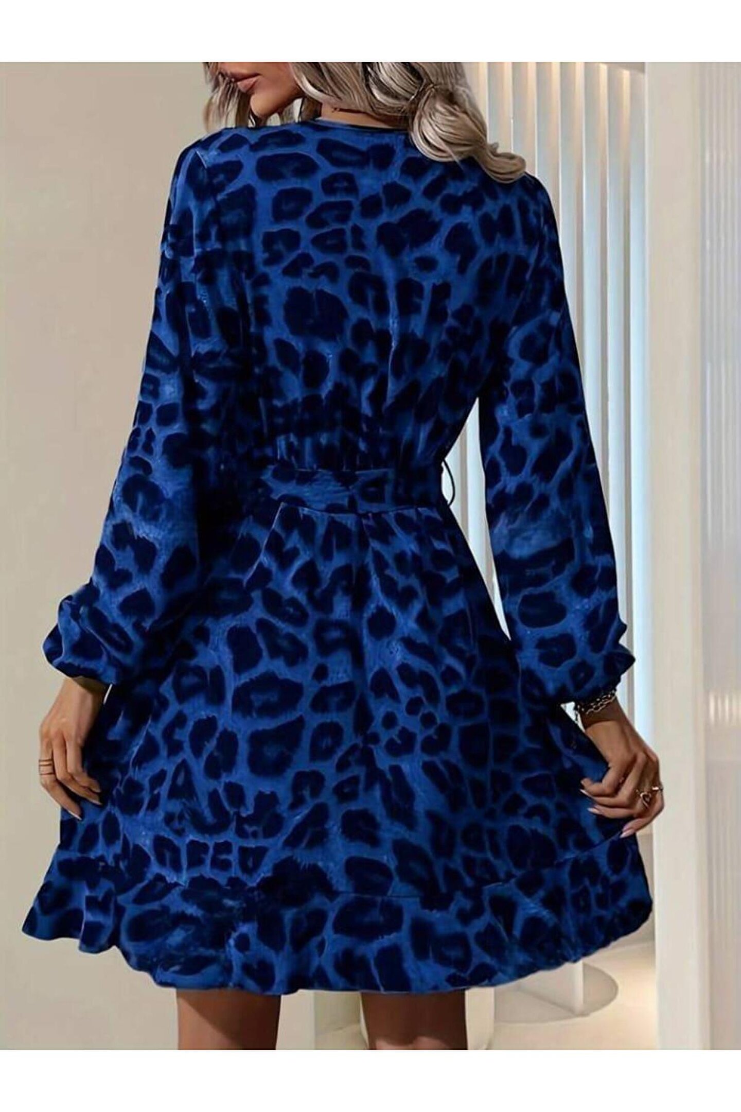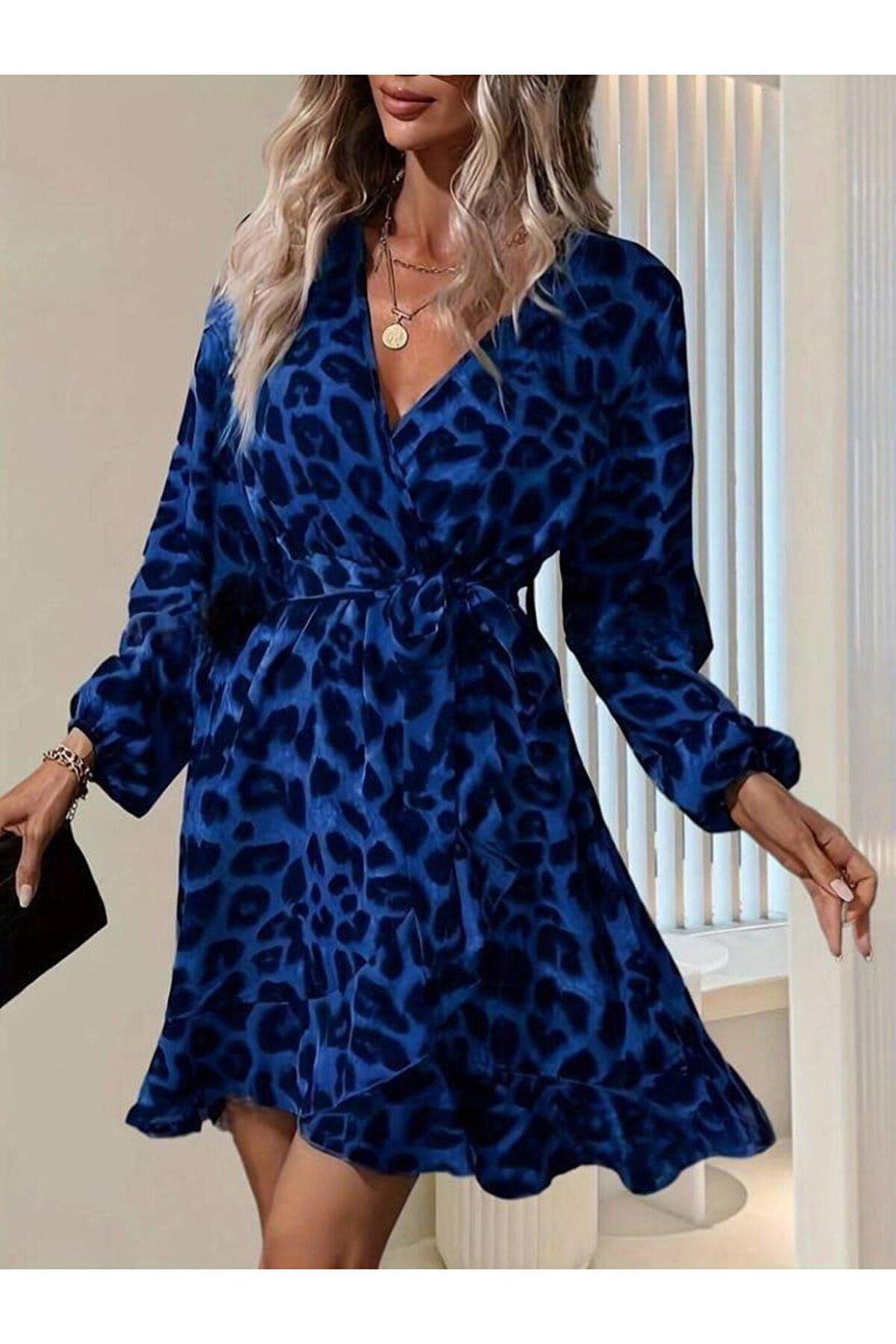 VogueEra Kadın Uzun Kollu Kruvaze Yaka Belden Kuşaklı çapraz Kesim Detaylı Leopar Modal Mini Elbise