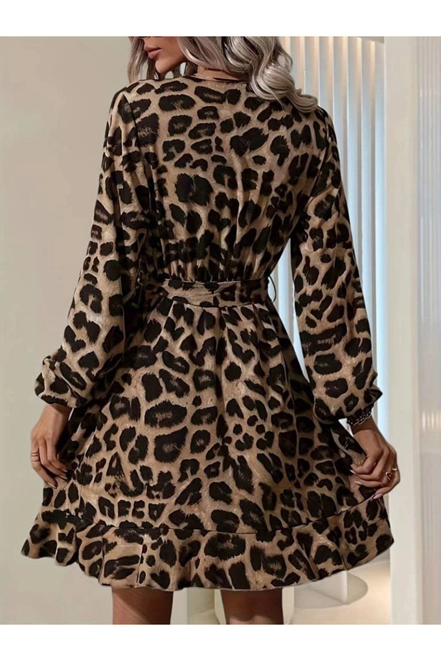 VogueEra Kadın Uzun Kollu Kruvaze Yaka Belden Kuşaklı çapraz Kesim Detaylı Leopar Modal Mini Elbise