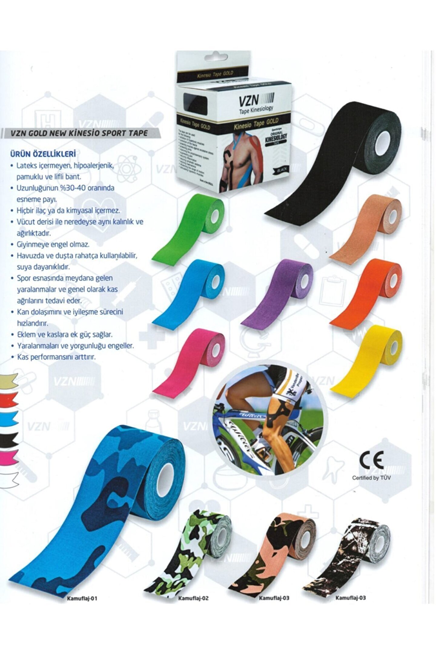 Vzn kinesiology kas ağrı bandı, yapışkan tasarımı, insan derisi ile aynı elastikliğe sahip olmasıyla beraber nöro-Müsküler sistemin tekrar eğitilmesi ve iyileştirilmesi konusunda kan ve lenf dolaşımını hızlandırarak ve aynı zamanda kas ağrılarını azaltarak yardımcı olmaktadır. Kinesiology kas ağrı bandı; fizyoterapistler, diğer terapistler, atletler, masörler, doktorlar, hemşireler ve çeken kişiler tarafından kullanılabilir. özellikler - lateks içermeyen, hipoalerjenik, pamuklu ve lifli bant. - uzunluğunun %30-40?I oranında esneme payı. - hiçbir ilaç ya da kimyasal içermez. - vücut derisi ile neredeyse aynı kalınlık ve ağırlıktadır. - giyinmeye engel olmaz. - havuzda ve duşta rahatça kullanılabilir, suya dayanıklıdır. - spor esnasında meydana gelen yaralanmalar ve genel olarak kas ağrılarını tedavi eder. - kan dolaşımını ve iyileşme sürecini hızlandırır. - eklem ve kaslara ek güç sağlar. - yaralanmaları ve yorgunluğu engeller. - kas performansını arttırır.;