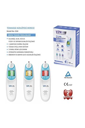 Çoklu Fonksiyon : Kulak, alın, oda sıçaklığını dijital olarak ölçer.; ; Hijyenik : Sadece silerek temizleyin, prob kılıfları gerektirmez.; ; Hızlı ve Doğru : 3. nesil sıcaklık ölçüm teknolojisinden faydalanın, sadece 1 saniyede doğru okuma.; ; Kolay Kullanım : Sadece bir düğme ile çalıştırma, çok basit kullanım.; ; Bellek Fonksiyonu : Cihaz açıldığında son etkili vücut sıcaklığını gösterir.; ; Renkli ana ekranı mevcuttur.; ; Vücut, süt, su ve ortam sıcaklığını da ölçer.; ; 2 yıl garantisi vardır.; ; ===========================================================================================================================