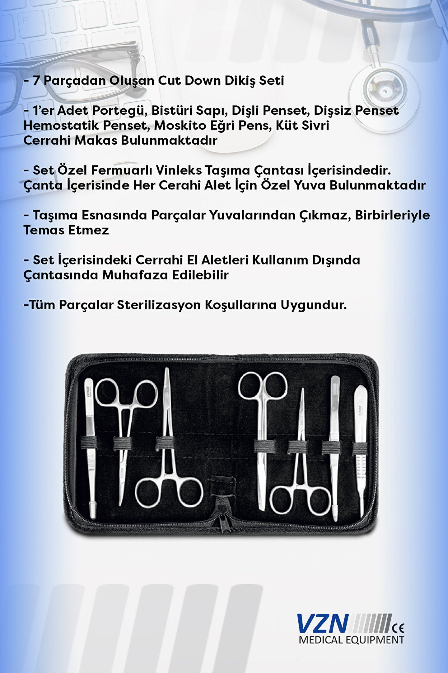 Açıklama Cut Down Dikiş Seti Toplam 7 parçadan oluşan Cut Down dikiş seti içerisinde 1’er adet portegü, bistüri sapı, klemp, hemostatik penset dişli, moskito eğri, koher pensi, makas eğri bulunmaktadır. ; Set özel fermuarlı vinleks taşıma çantası içerisindedir ve çanta içerisinde her cerrahi alet için özel yuva bulunmaktadır. ; Taşıma esasında parçalar yuvalarından çıkmaz ve birbirleriyle temas etmez. ; Set içerisindeki cerrahi el aletleri kullanım dışında çantasında muhafaza edilebilir. ; Tüm parçalar sterilizasyon koşullarına uygundur. ; CE normlarına uygun olarak üretilen Cut Down dikiş seti 2 yıl garantilidir.;