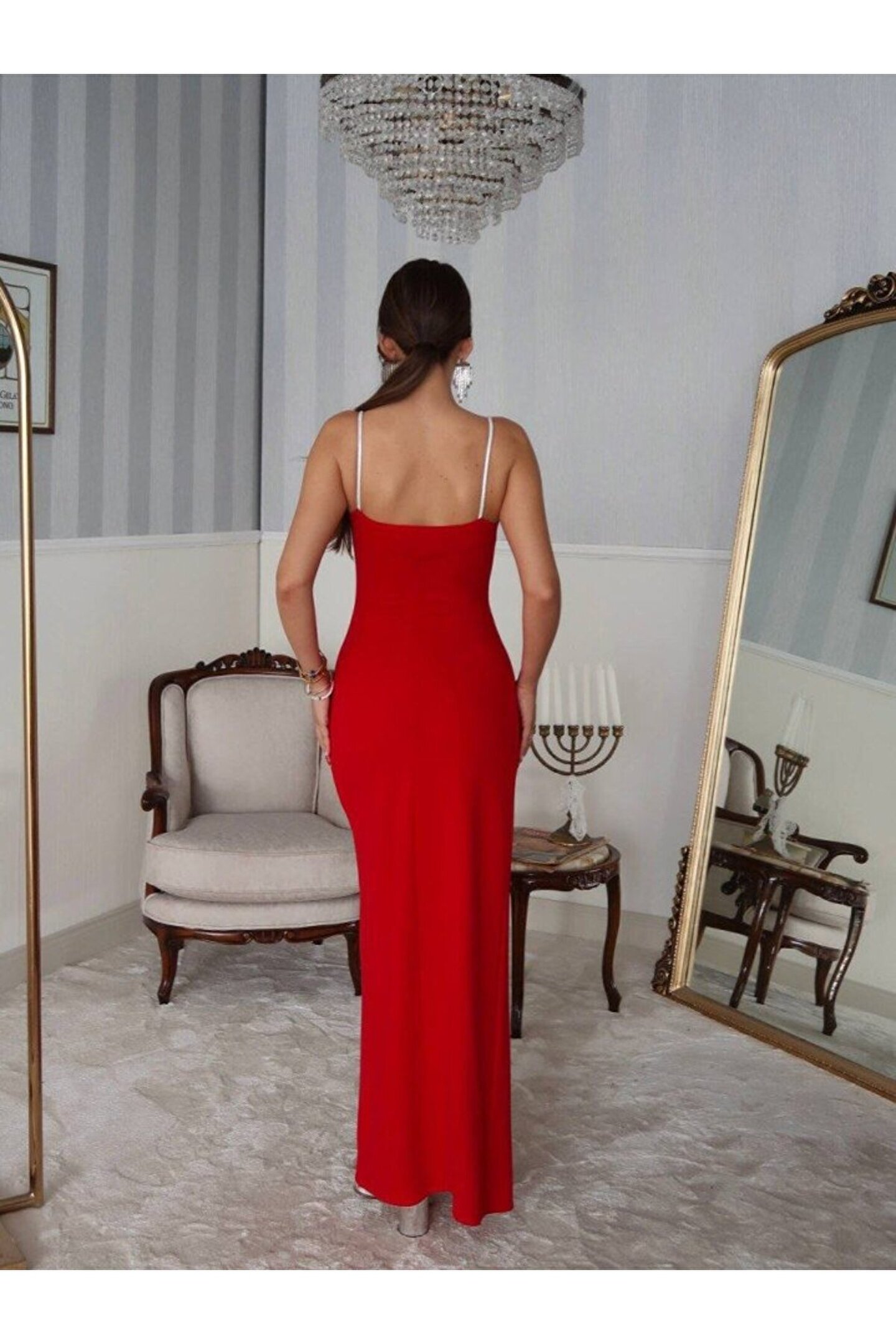 Kadın Omuz Askılı Derin Yırtmaç Detay Maxi Boy Elbise