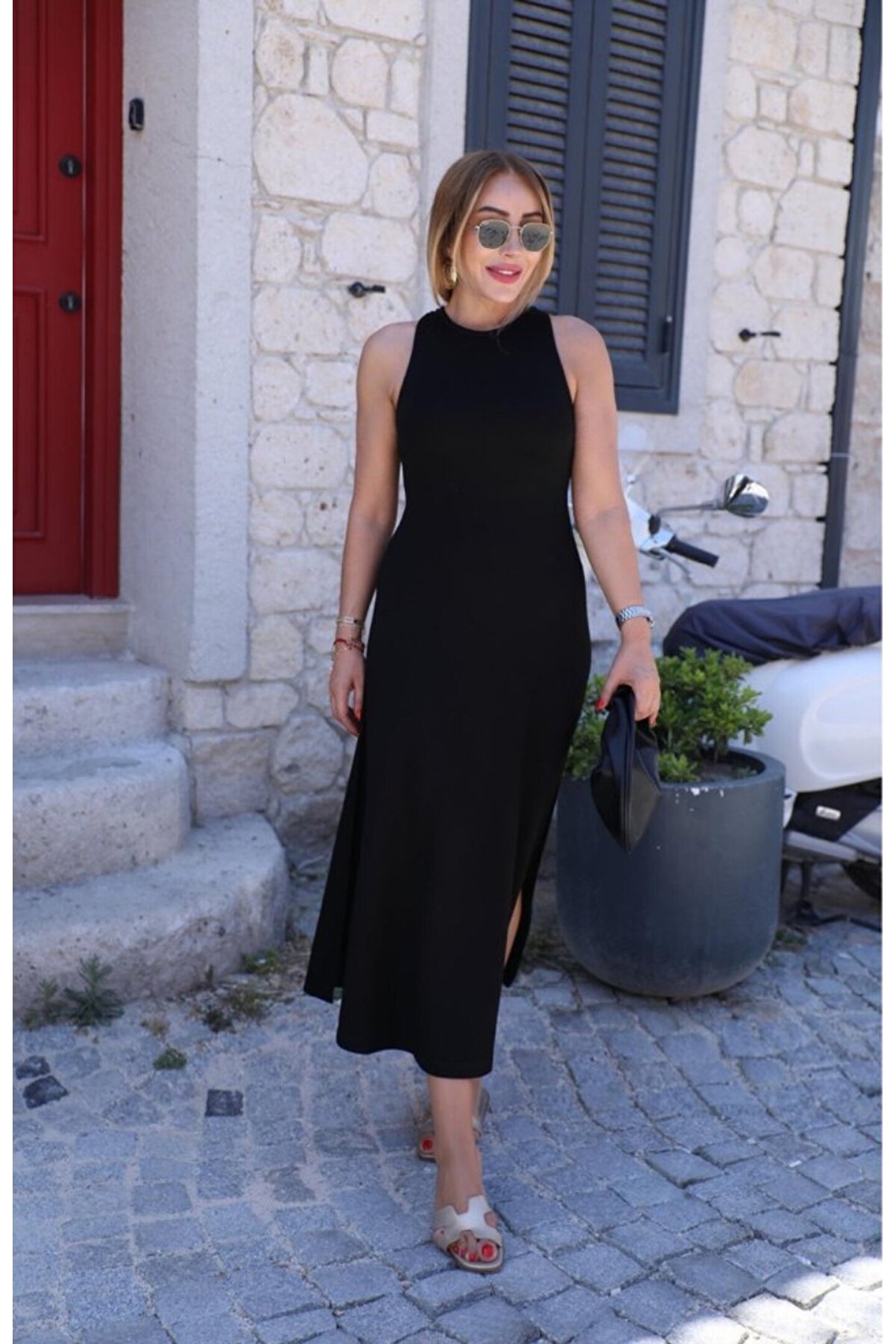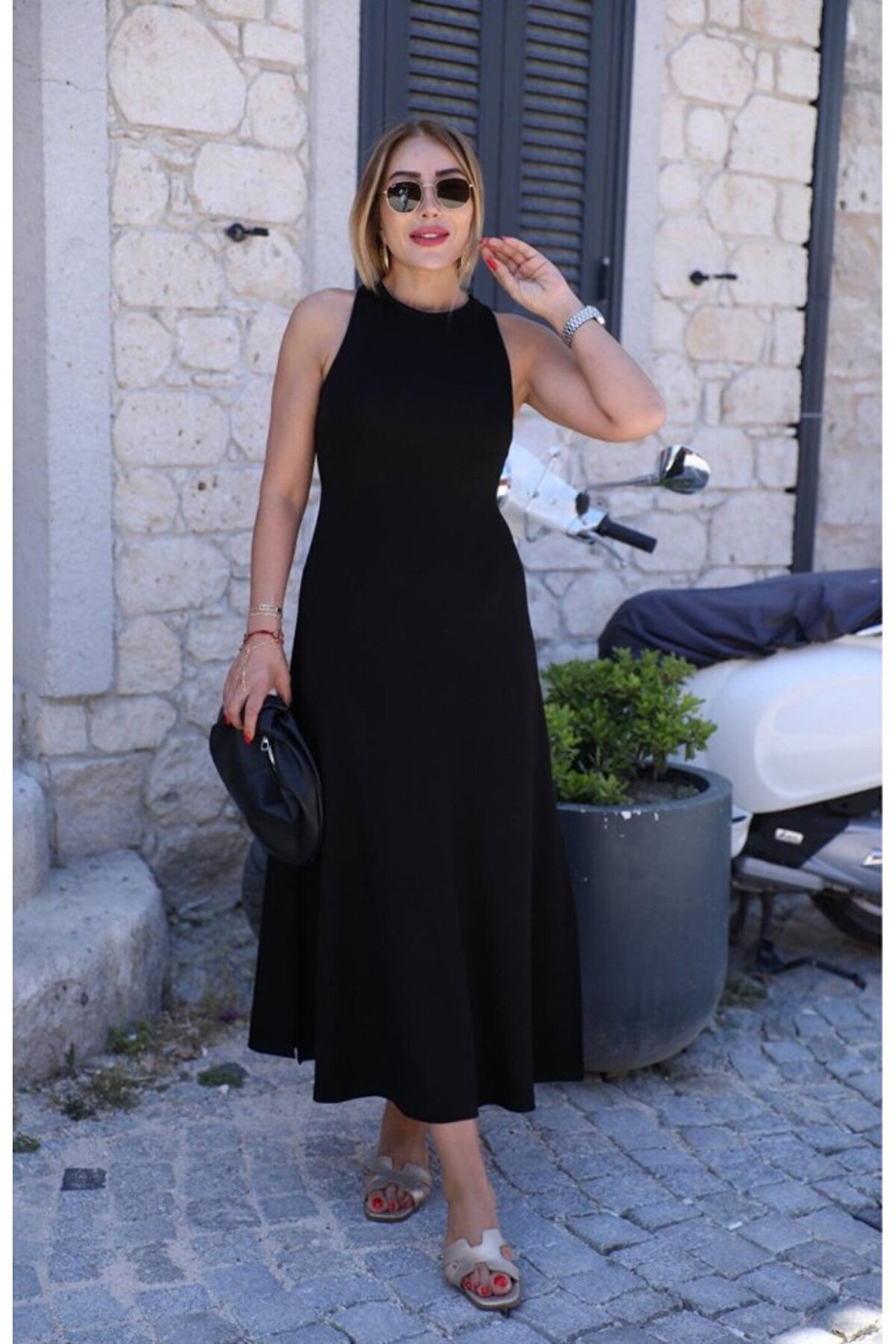 Kadın Omuzlardan Açık Arkadan Aksesuar Detaylı Yırtmaçlı Janjan Krep Elbise
