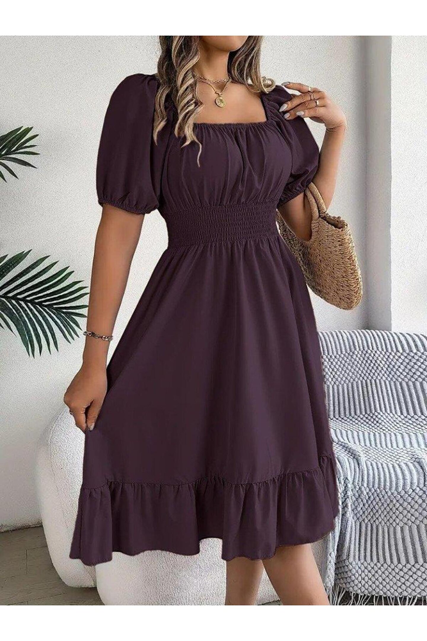 Wear Up Kadın Kısa Kollu Kare Yakalı Beli Lastikli Kısa Trikoton Elbise