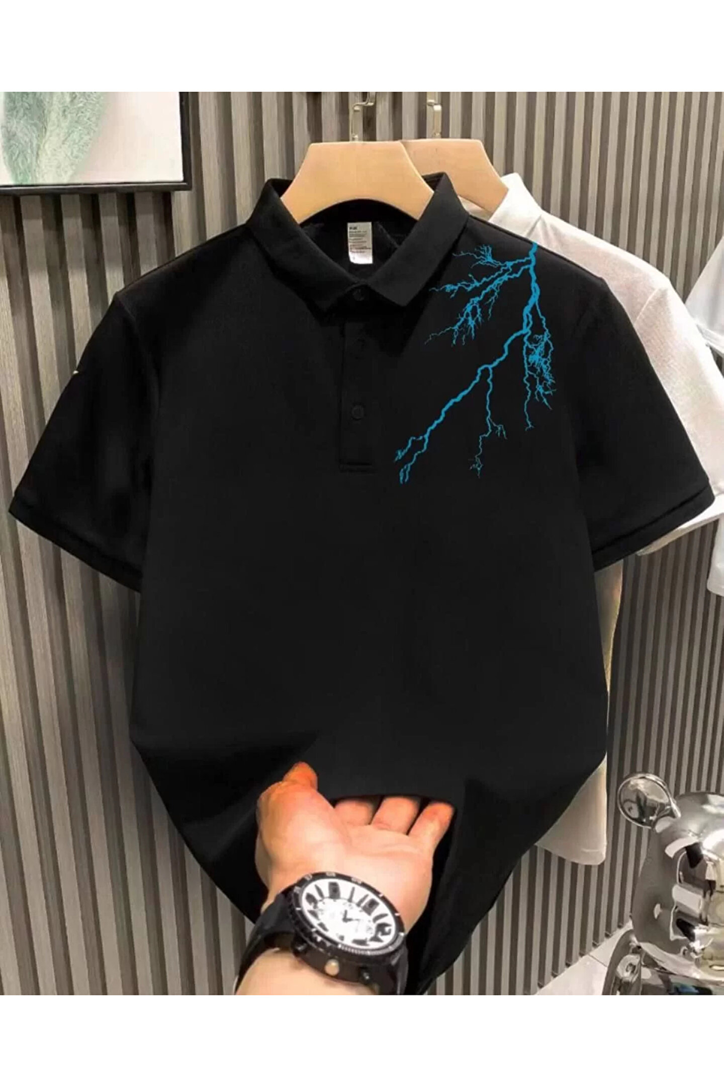 Wear Up Unisex Yakası Düğmeli Oversize Baskılı T-Shirt - Siyah