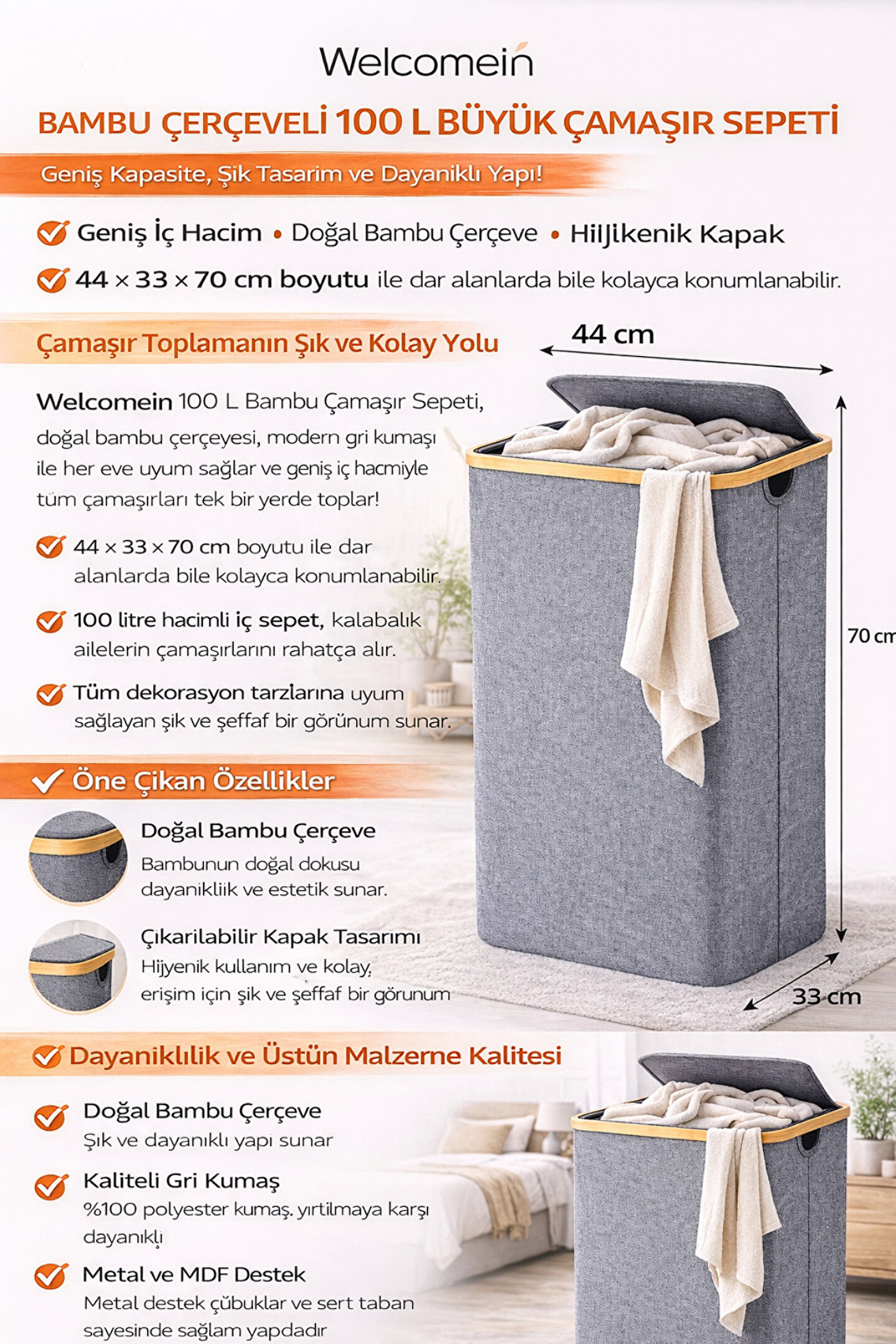 Üst kısımdaki doğal bambu çerçeve, sepete hem şık hem de sağlam bir görünüm kazandırırken, kapaklı tasarım çamaşırların görünmesini engeller ve banyonuza düzenli bir hava verir. Yan kısımlardaki taşıma boşlukları sayesinde sepet odalar arasında rahatça taşınabilir.