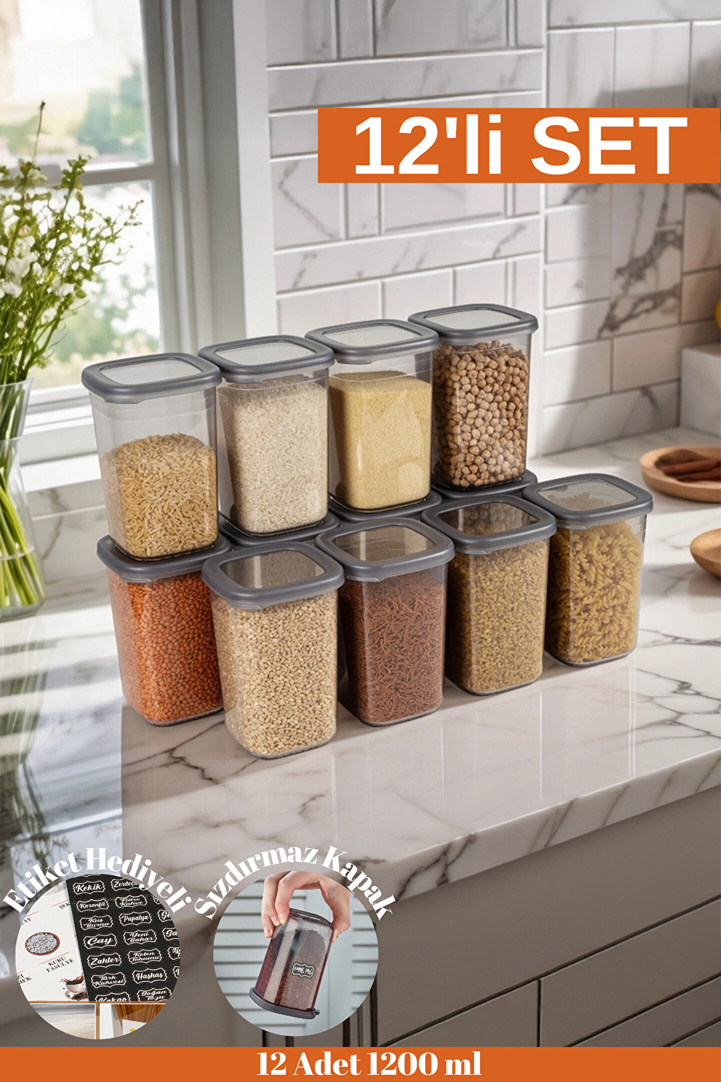 İhtiyaçlarınıza Uygun Boyut Kombinasyonu — Mutfak saklama kabı setimiz tek boyutta gelir. Spagetti, fırın malzemeleri, tahıl, un, şeker, yulaf, makarna, pirinç, kahve, çay, atıştırmalıklar, kuruyemişler ve diğer kuru gıdaları saklamak için mükemmeldir.