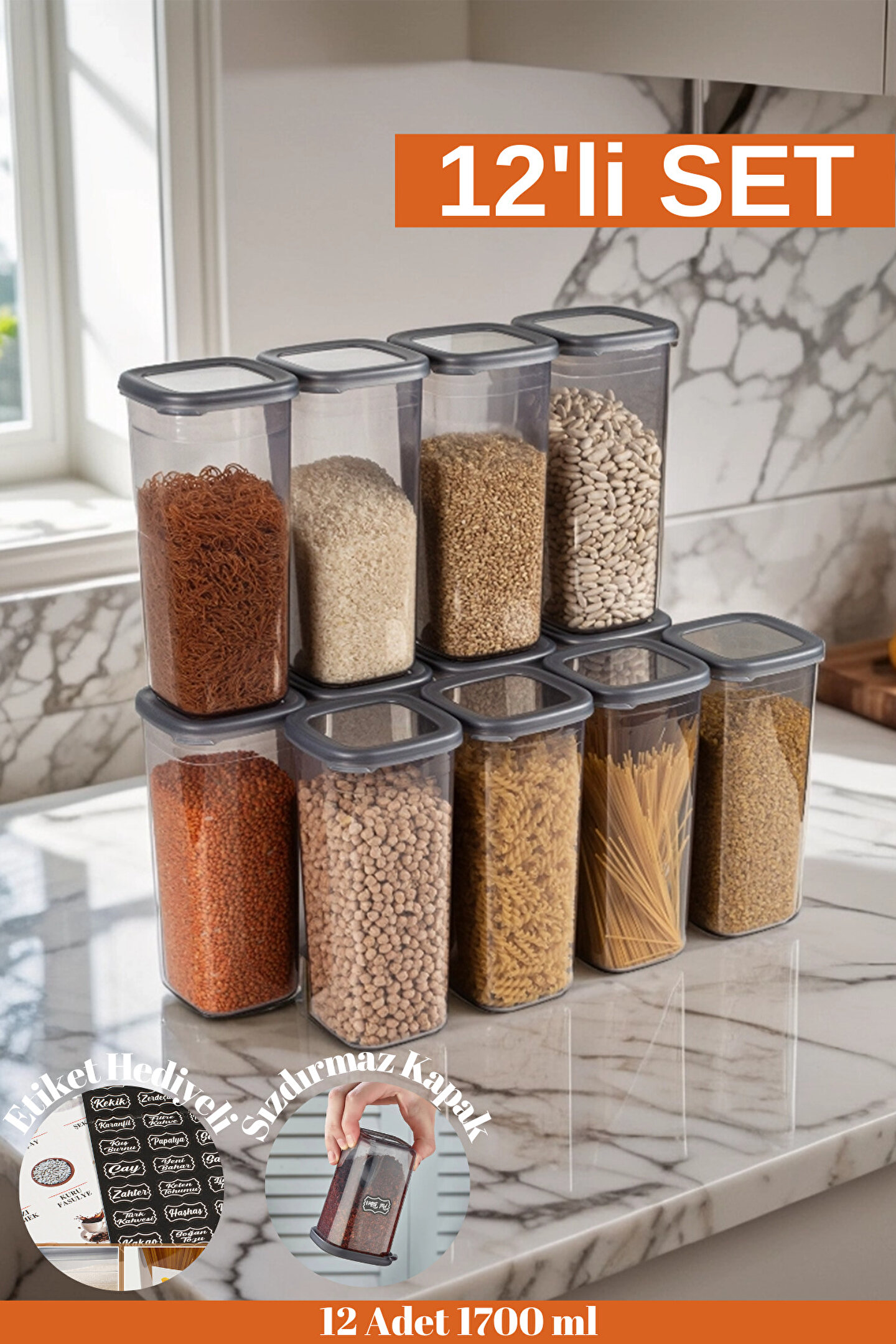 welcomein 12 Adet 24 Parça Etiketli 1750 ml. Sızdırmaz Kapaklı Kare Erzak Bakliyat Saklama Kabı Seti