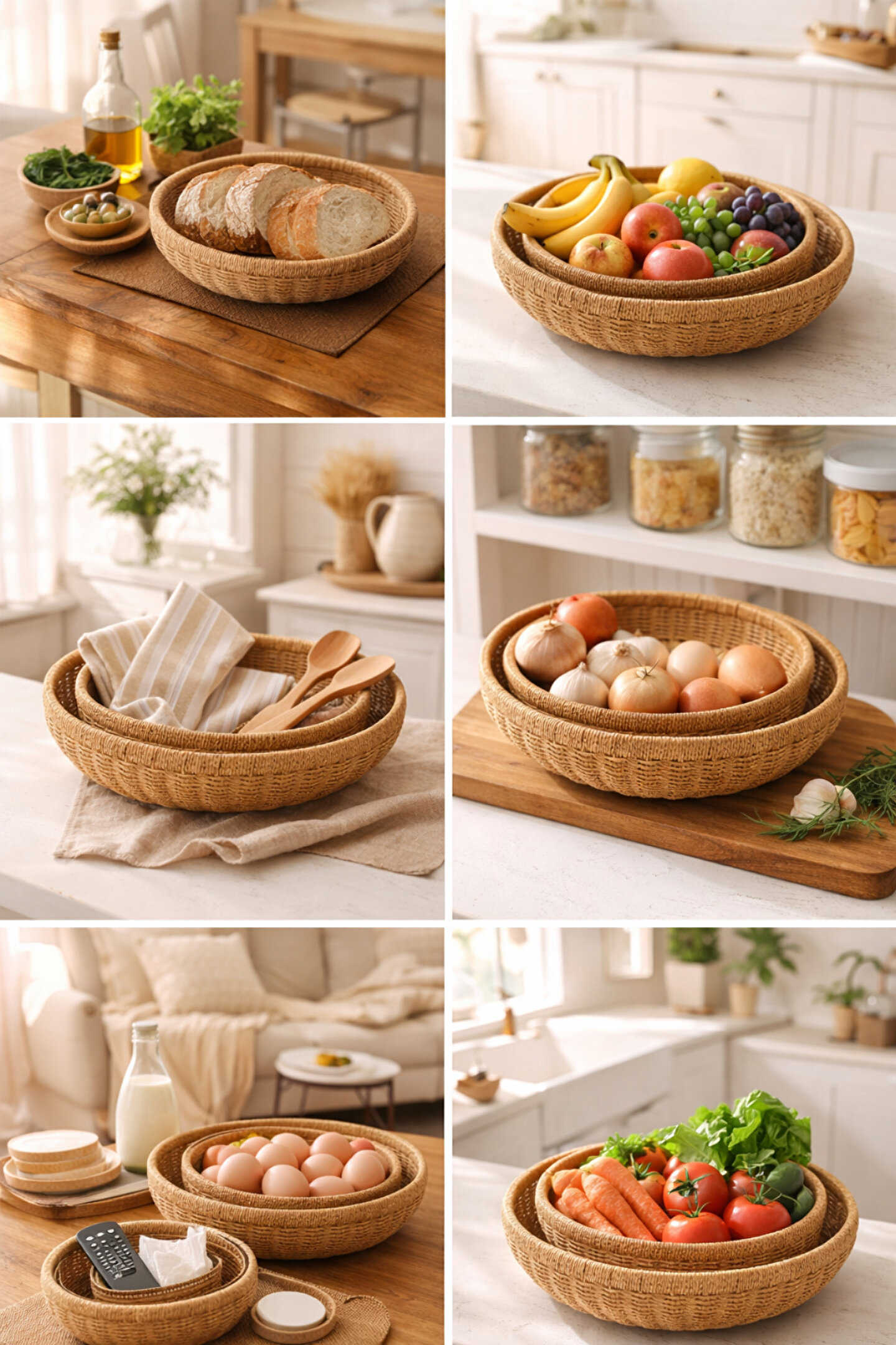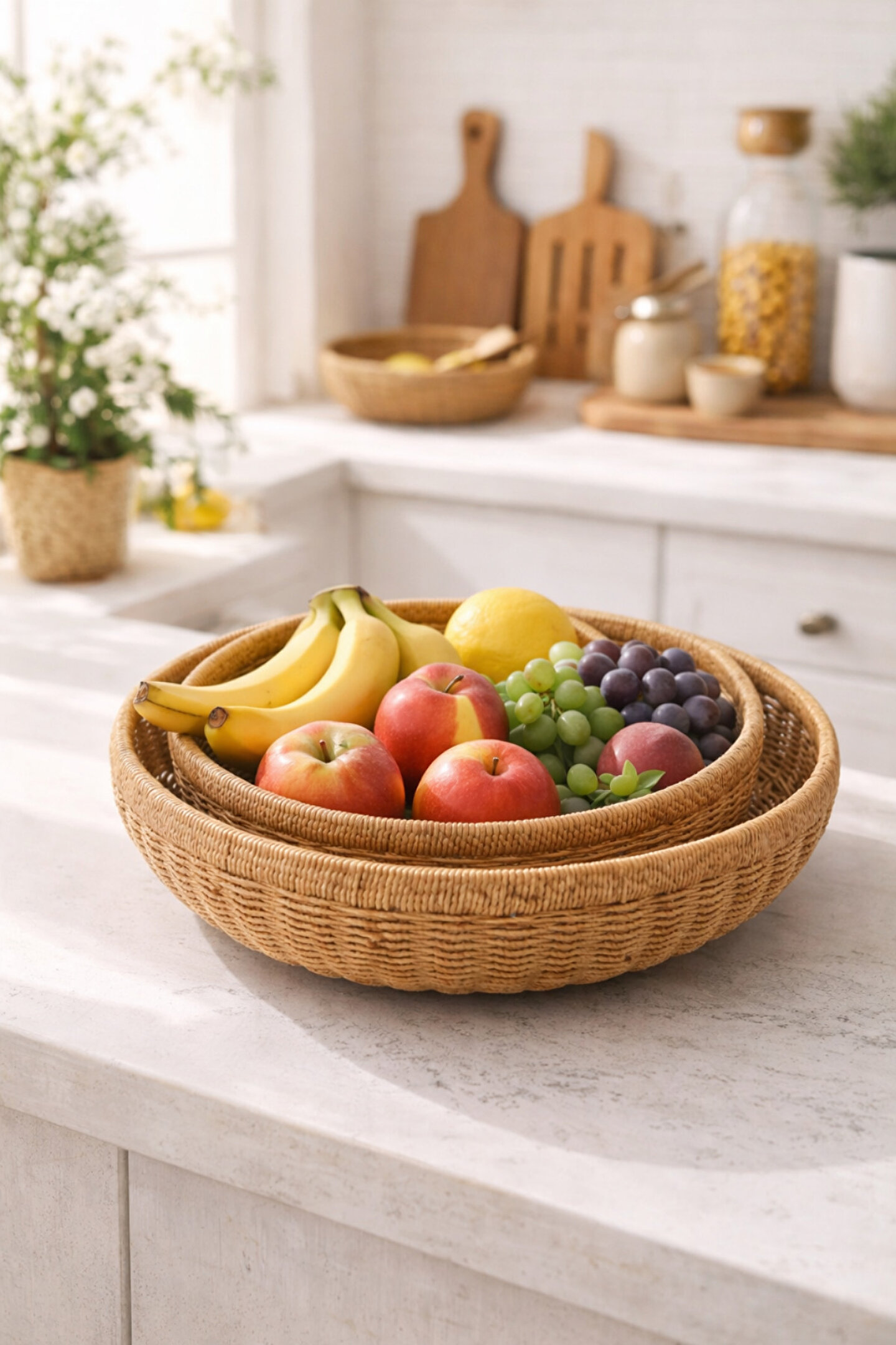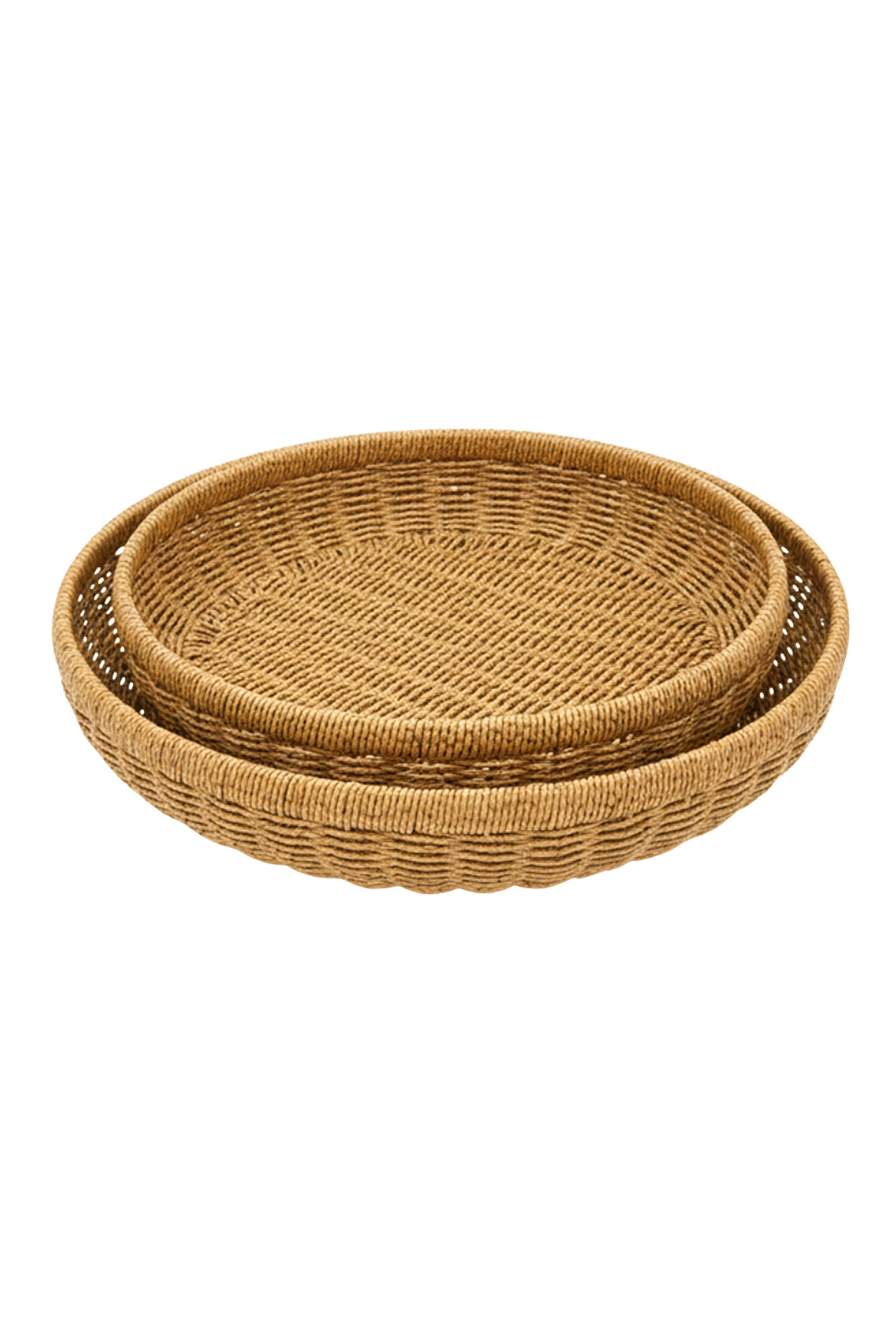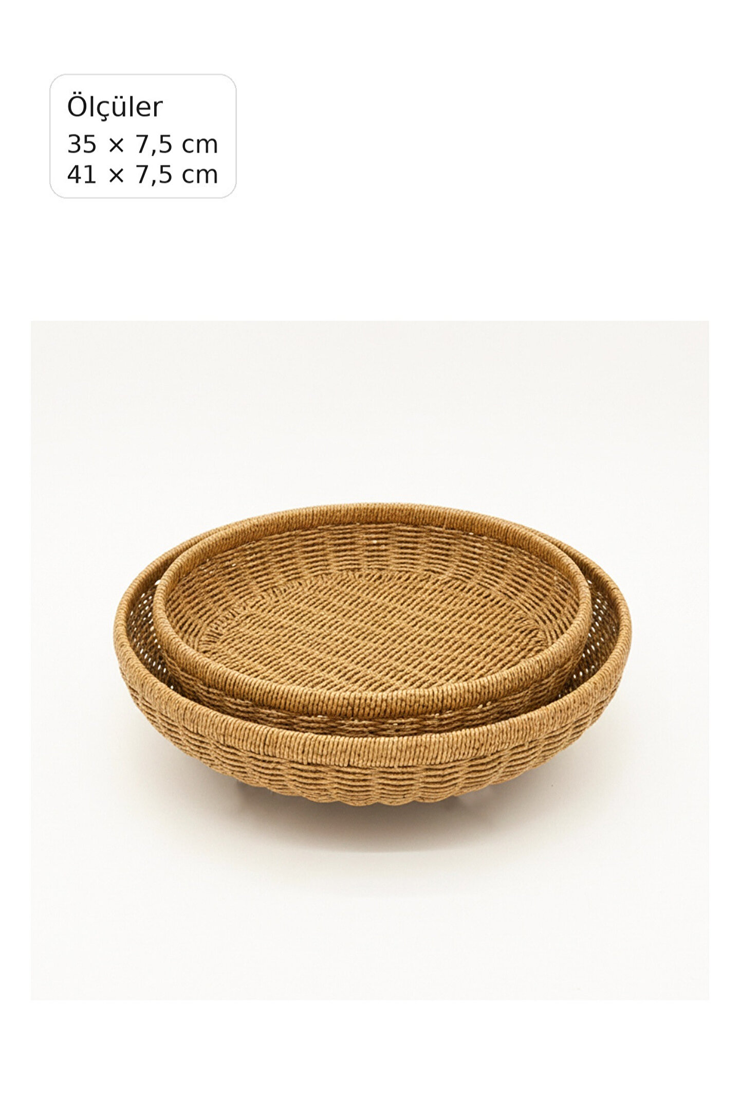 Doğal ve sıcak bir görünüm sağlayan yuvarlak hasır tepsi seti, sunumlarınızı şıklaştırır ve ev dekorunuza uyum sağlar.; 2 farklı boy tepsiden oluşur ve iç içe geçerek yerden tasarruflu şekilde saklanır.; Öne Çıkan Özellikler 2’li set: Büyük + küçük yuvarlak tepsi Çok amaçlı kullanım: Kahvaltı/çay sunumu, servis, atıştırmalık, dekor Düzenleyici olarak ideal: Mum, oda kokusu, anahtar, takı, kozmetik, banyo aksesuarı İç içe saklama: Daha az yer kaplar Dekoratif görünüm: Bohem, minimal, rustik ve modern tarzlarla uyumlu Kullanım Alanları Mutfak, salon, banyo, balkon/teras; kahve köşesi, servis masası, orta sehpa düzeni.; Temizlik & Bakım Nemli bir bezle siliniz.; Uzun süre suya maruz bırakmayınız.; (Doğal/örgü ürünlerde ton ve doku farklılıkları oluşabilir.; )