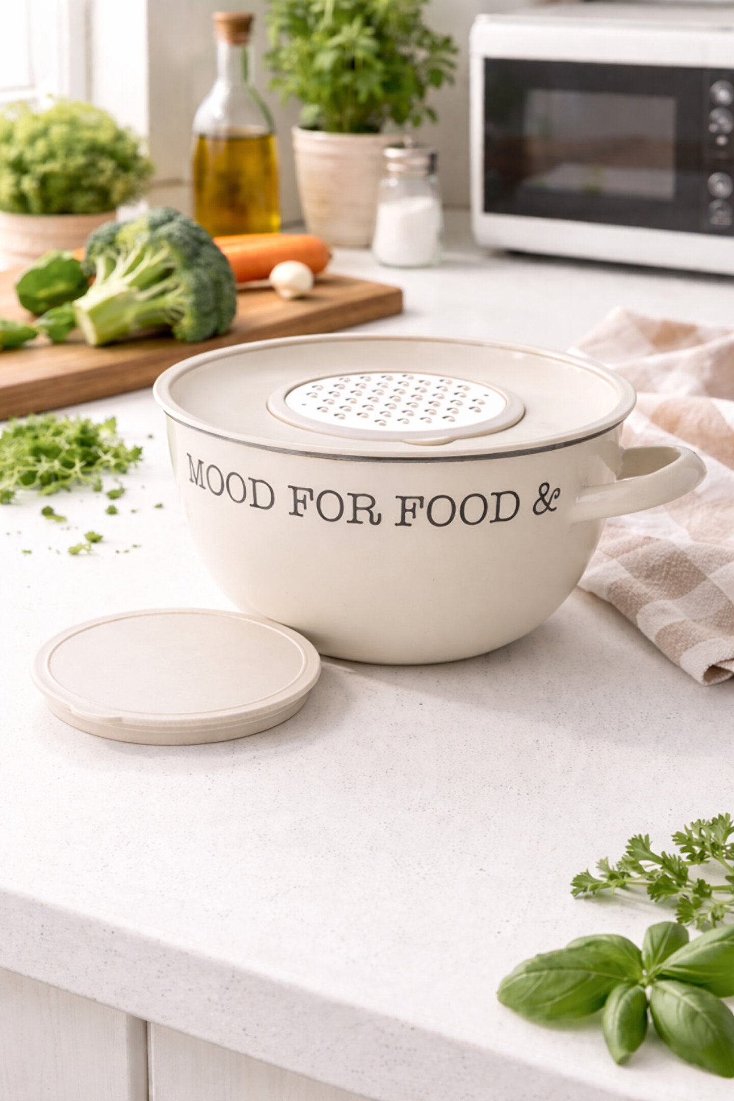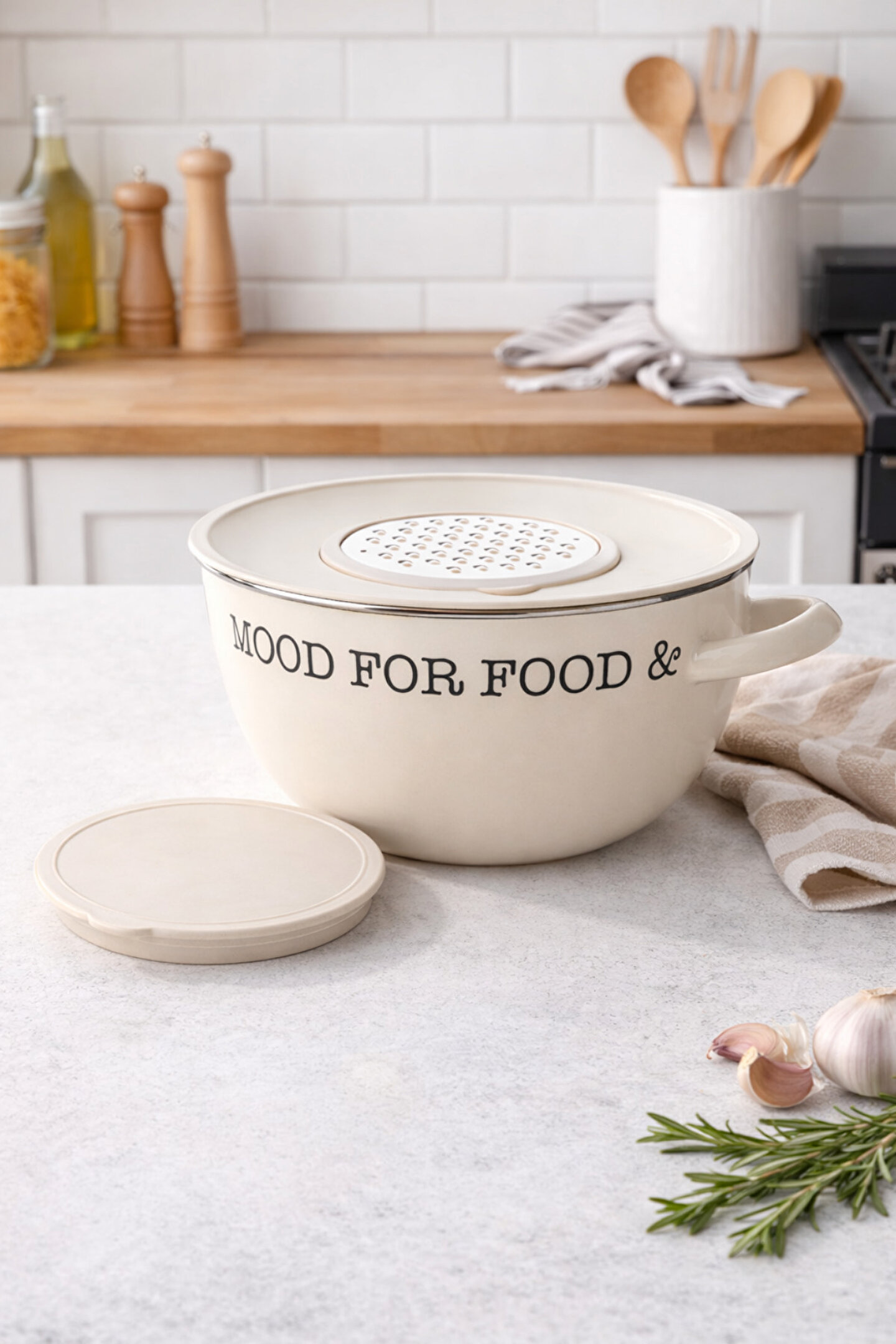 Soft krem renk & modern görünüm ile tezgah üzerinde dekoratif durur, fotoğraf ve sunumlarda şık bir görüntü verir.