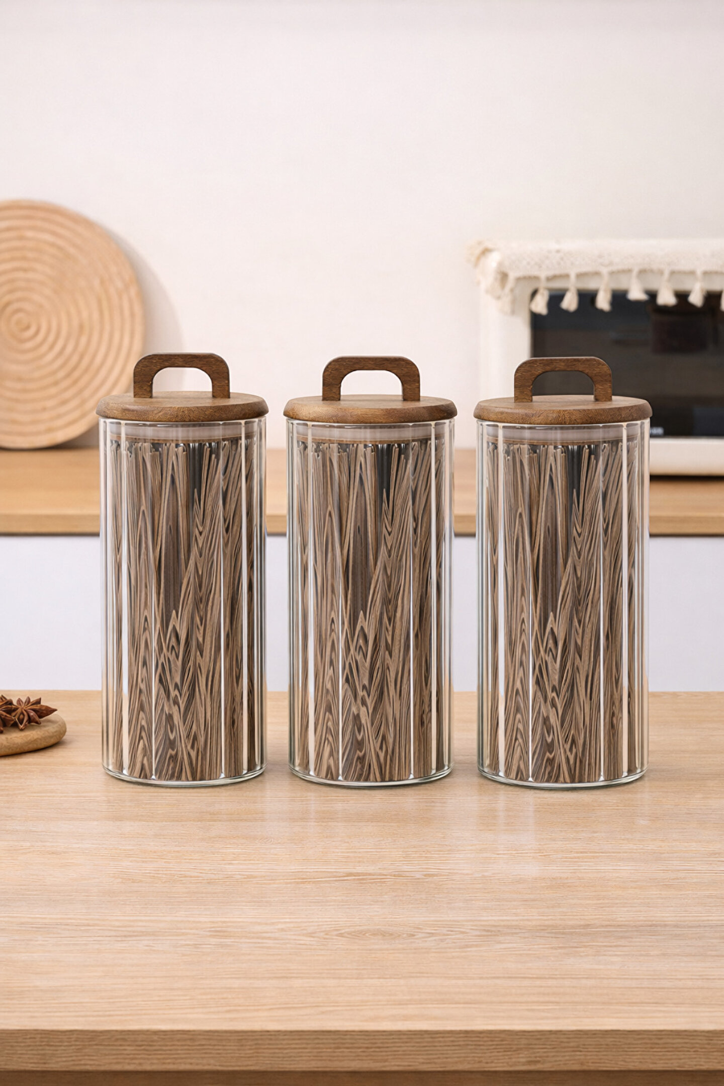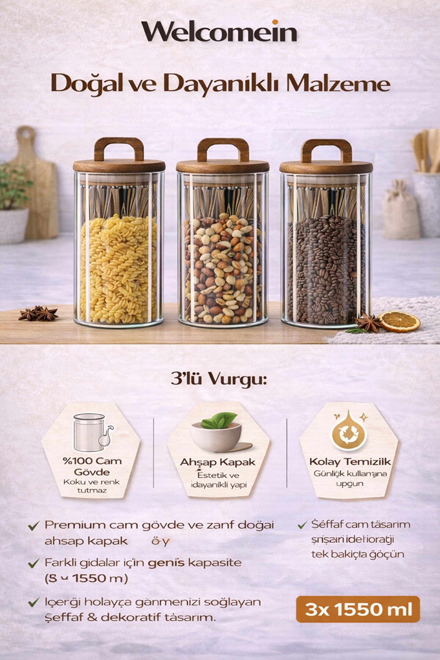 Welcomein 3’lü Cam Kavanoz Seti, mutfağınızda hem düzen hem de şıklık arayanlar için tasarlandı.