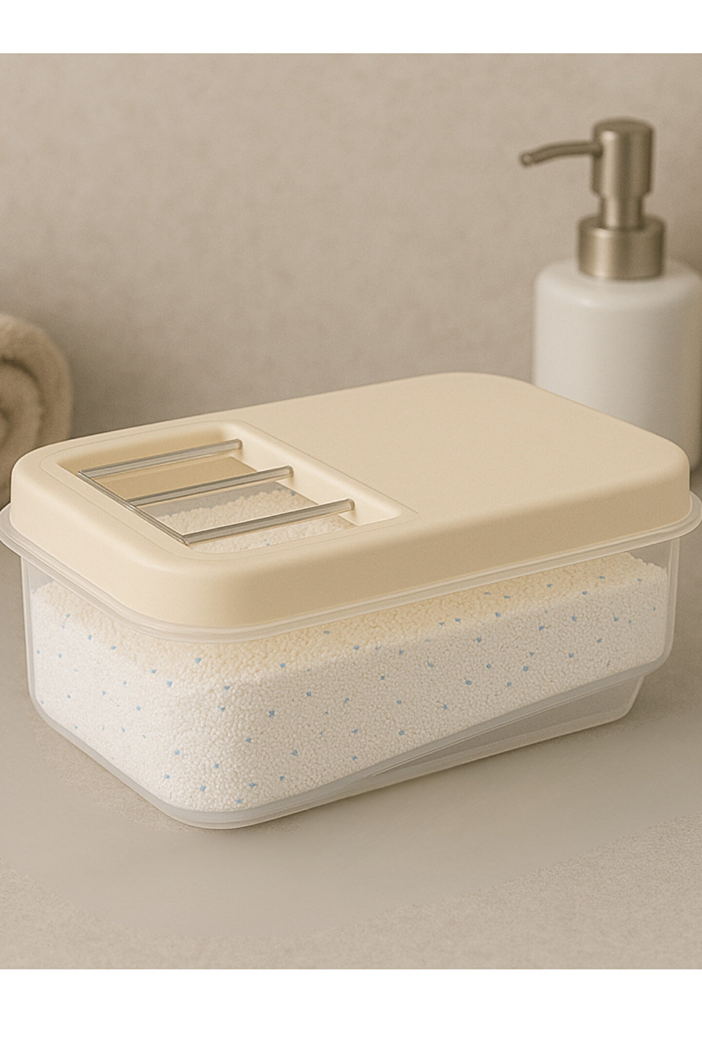 Banyonuzda düzeni ve şıklığı bir araya getiren bu 5 litrelik şeffaf deterjan saklama kabı, toz deterjanlarınızı hijyenik ve pratik şekilde muhafaza etmenizi sağlar.
