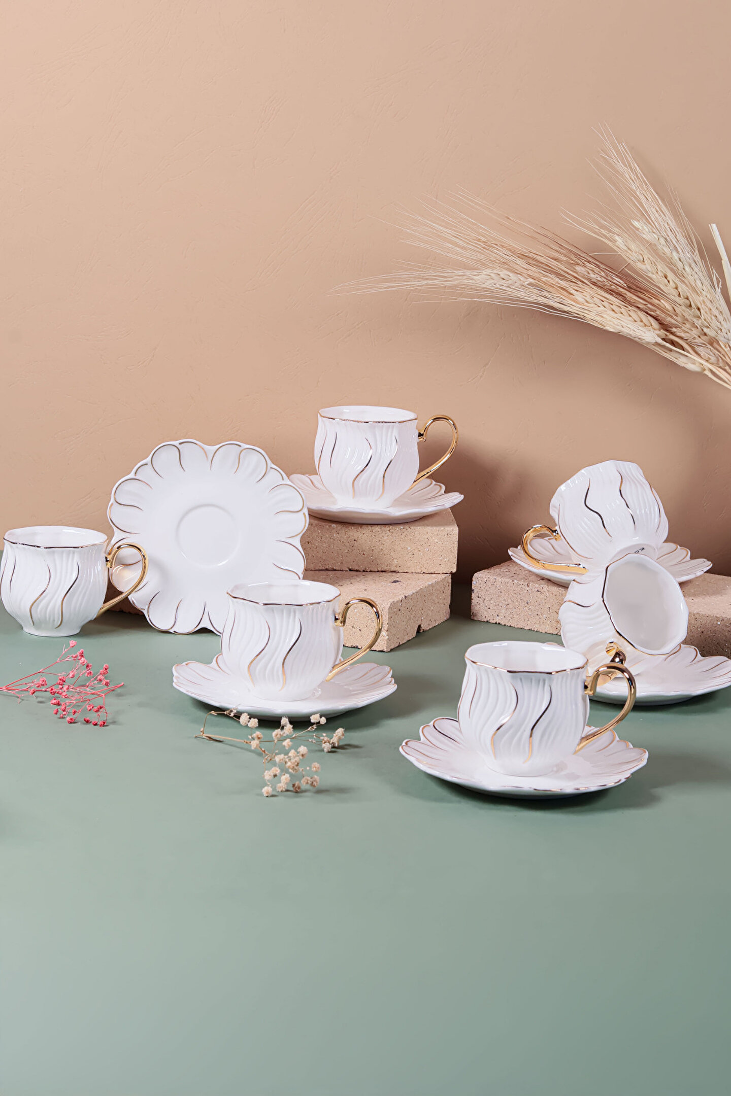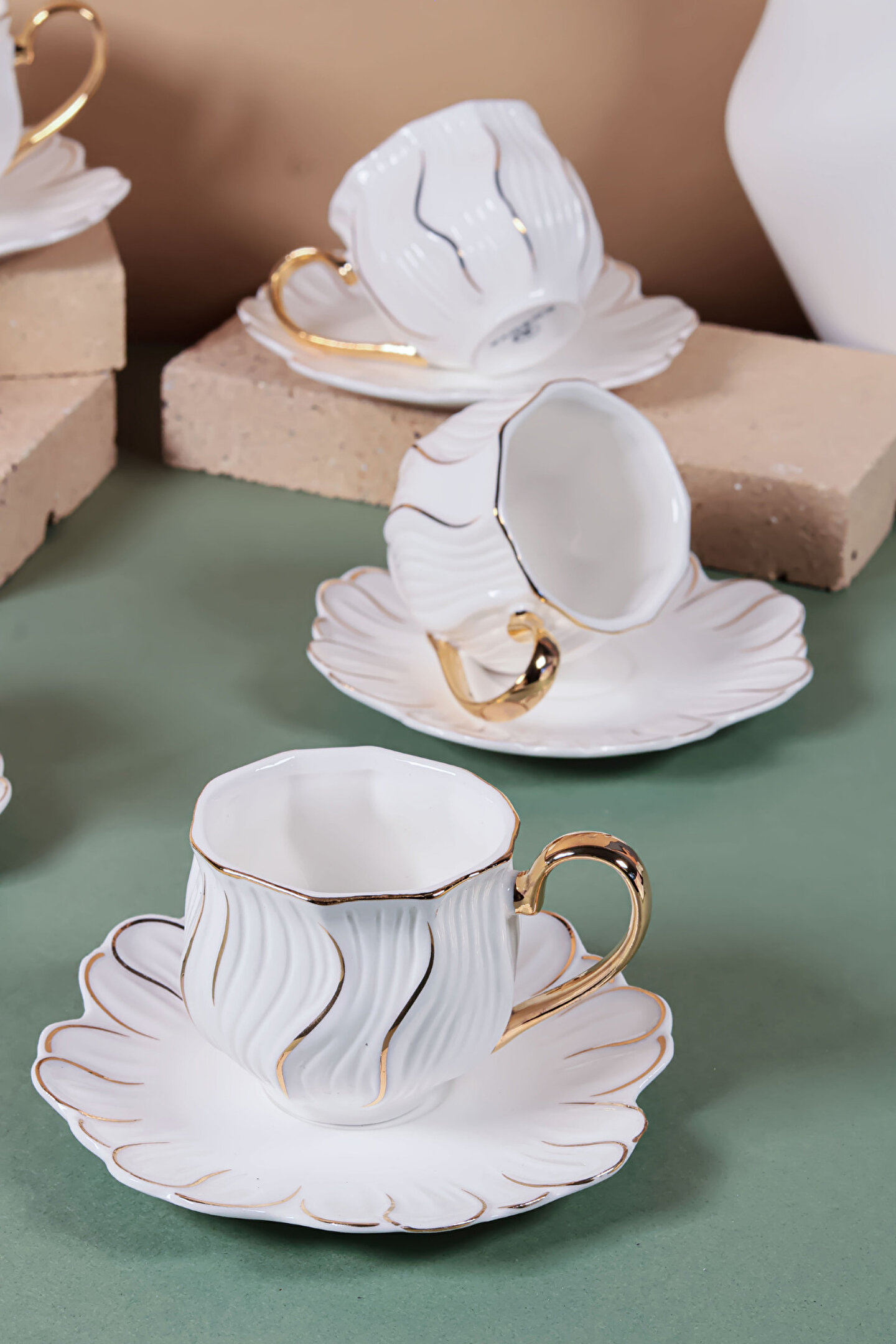 6’lı Altın Yaldızlı Kahve Fincan Takımı, 24 ayar altın detayları ve modern çizgileriyle kahve keyfinizi bambaşka bir boyuta taşıyor.