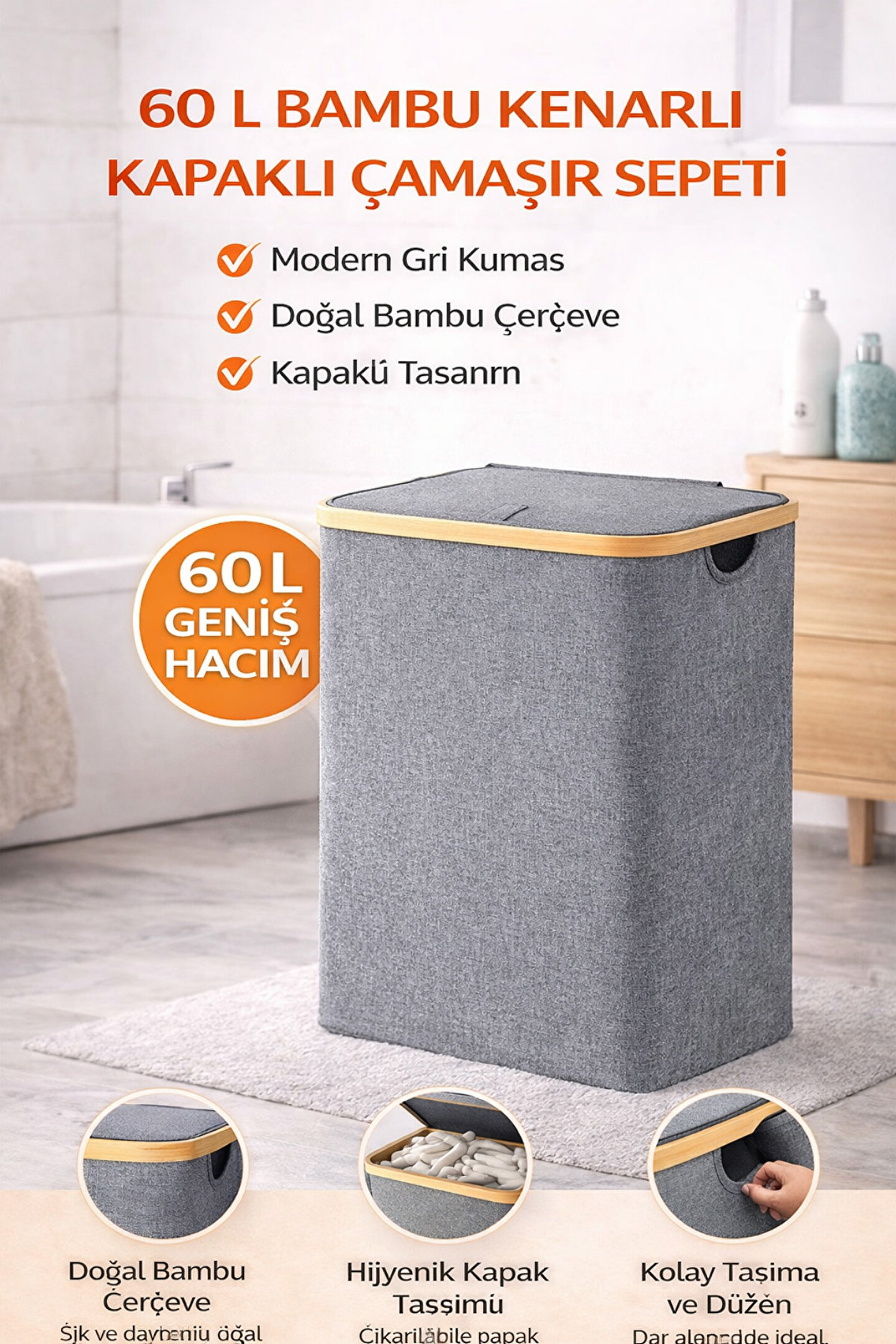 welcomein 60 L Bambu Kenarlı Kapaklı Çamaşır Sepeti – Gri Kumaş, Modern Kirli Sepeti
