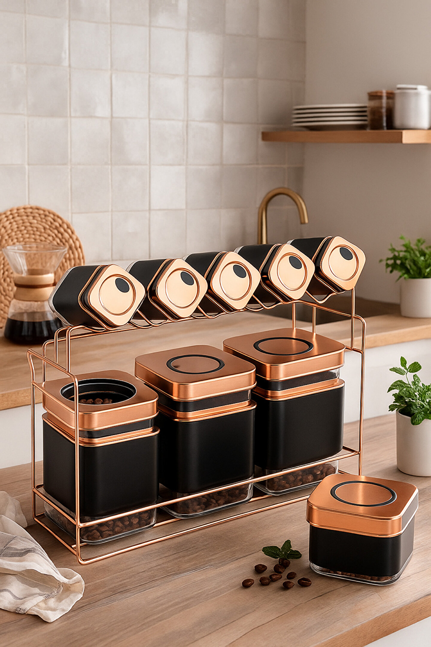 Mutfağınızda hem şıklık hem düzen istiyorsanız, bakır detaylı bu 9’lu saklama kabı ve baharatlık seti tam size göre. Siyah mat gövde ve rose gold/bakır kapak kombinasyonu, modern tezgahlarla mükemmel uyum sağlar; metal standı sayesinde tüm kavanozlarınız tek yerde, derli toplu durur.