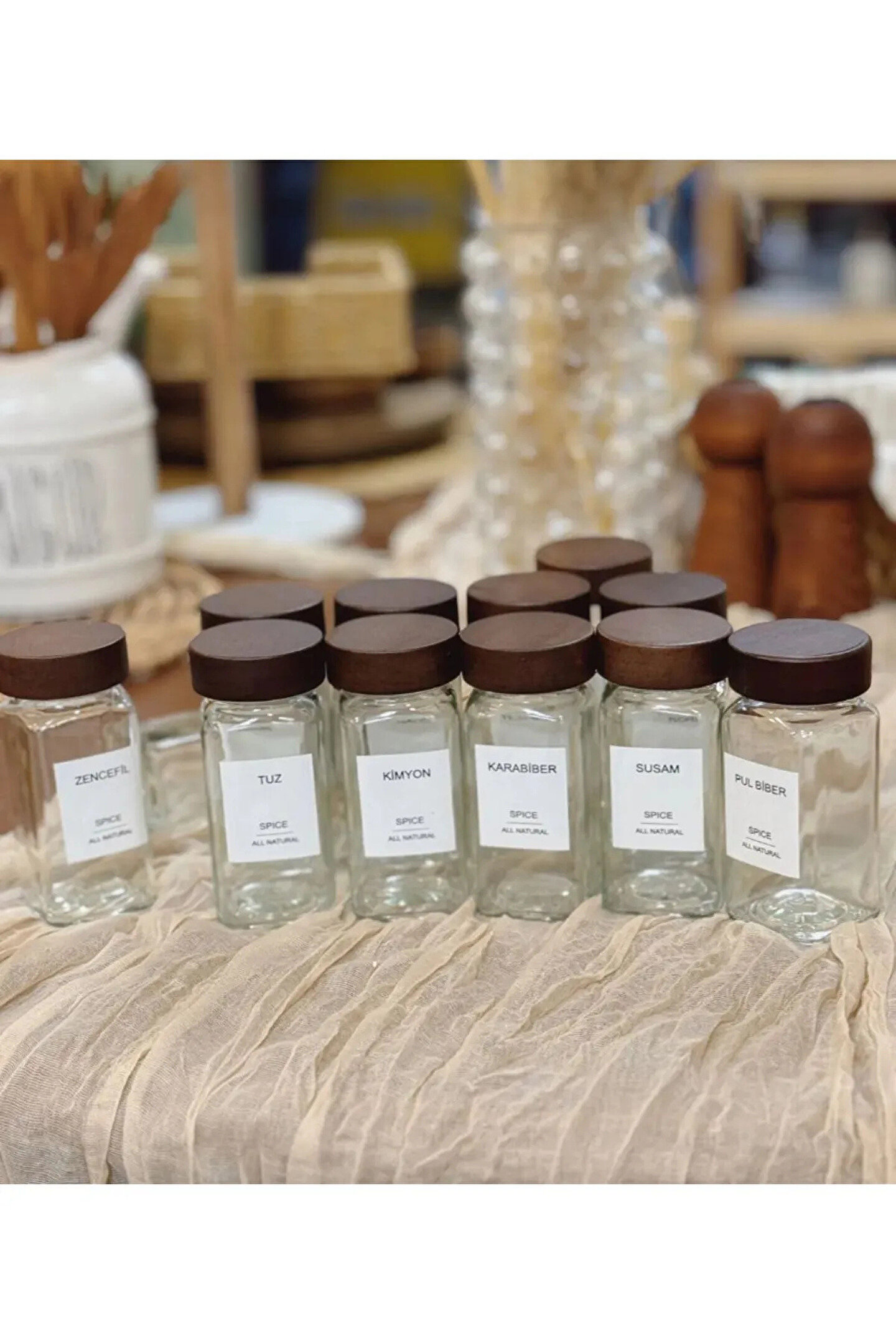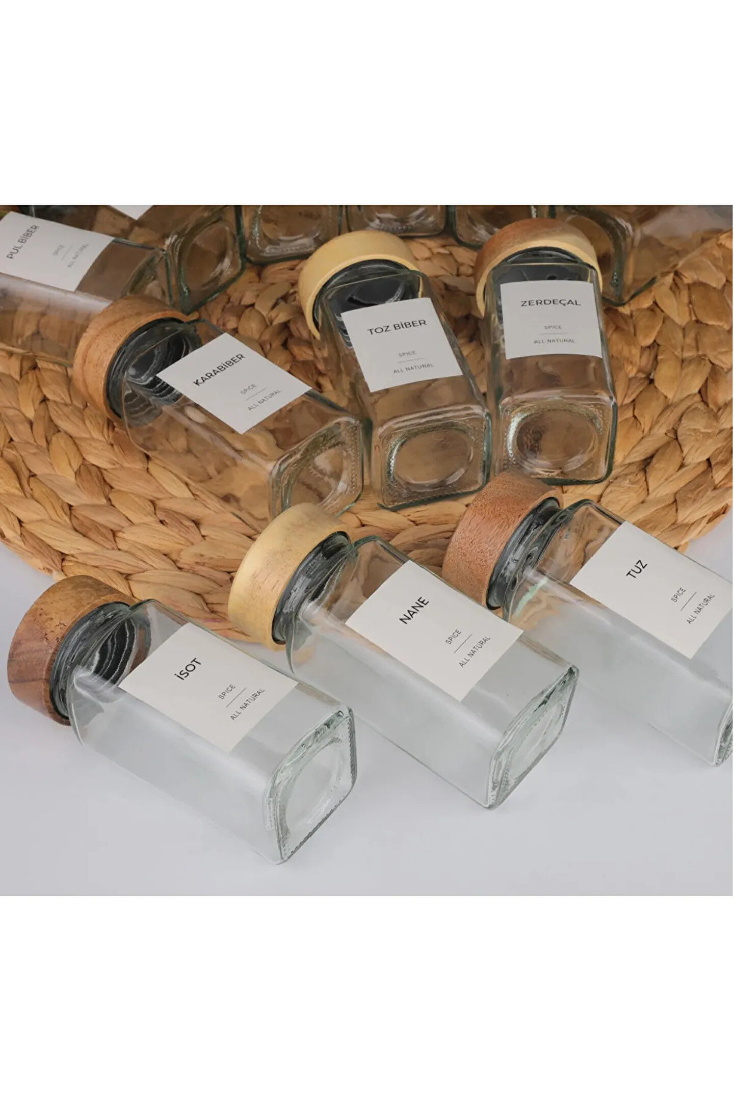welcomein Akasya Kapaklı Kare Formlu 12’li Cam Baharatlık Seti 120 ml 16 Adet Etiket Hediye
