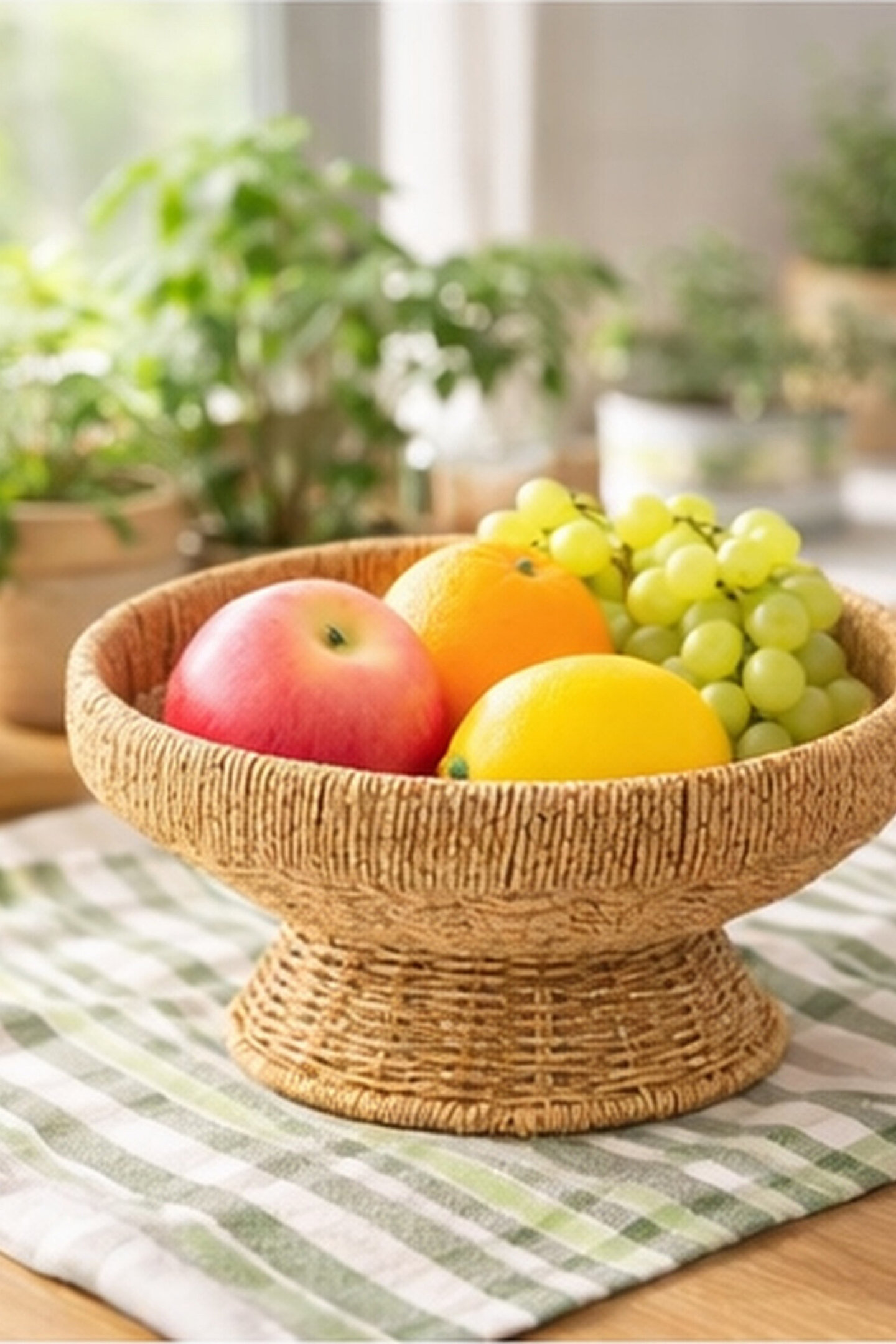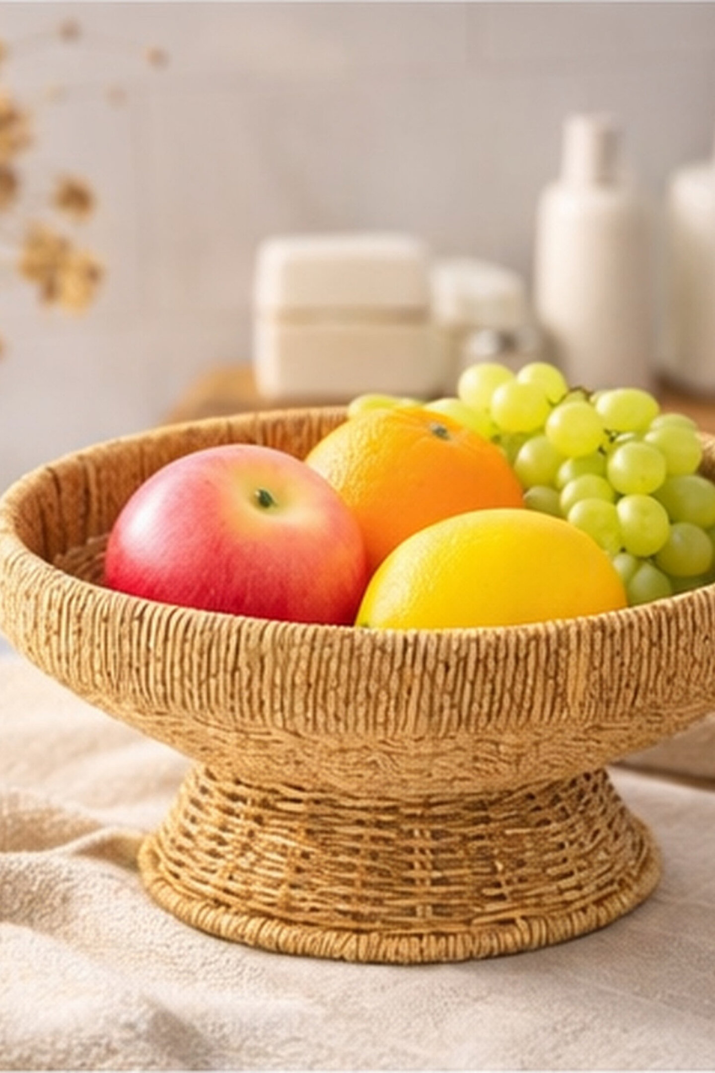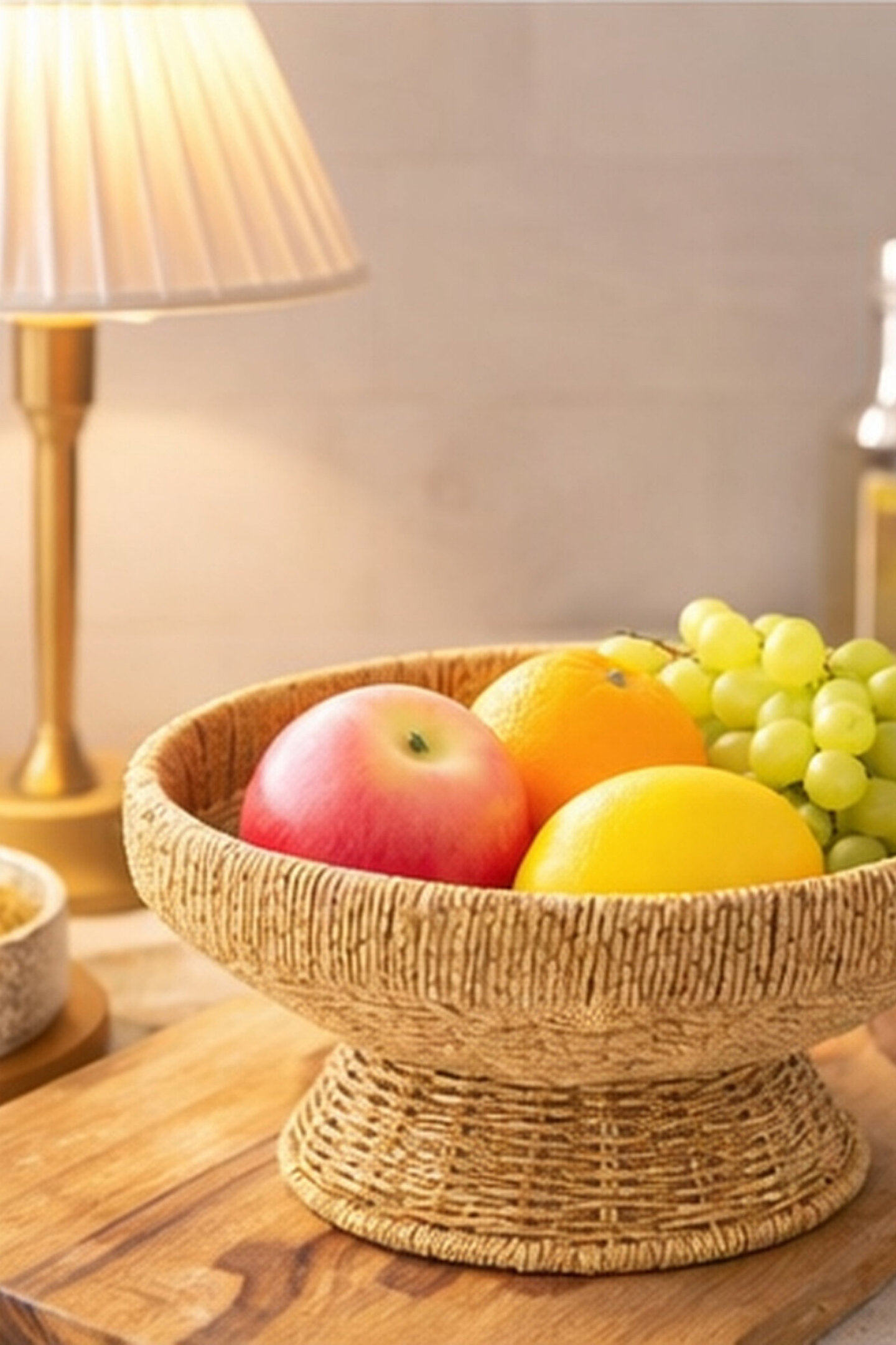 Doğal dokulu ayaklı rattan meyvelik, mutfak tezgahı ve masa üstünde hem şık sunum hem de düzenleme için ideal bir parçadır. Meyve–sebze servisi, kahvaltılık sunumları veya dekoratif amaçlı kullanım için sıcak ve doğal bir atmosfer oluşturur.