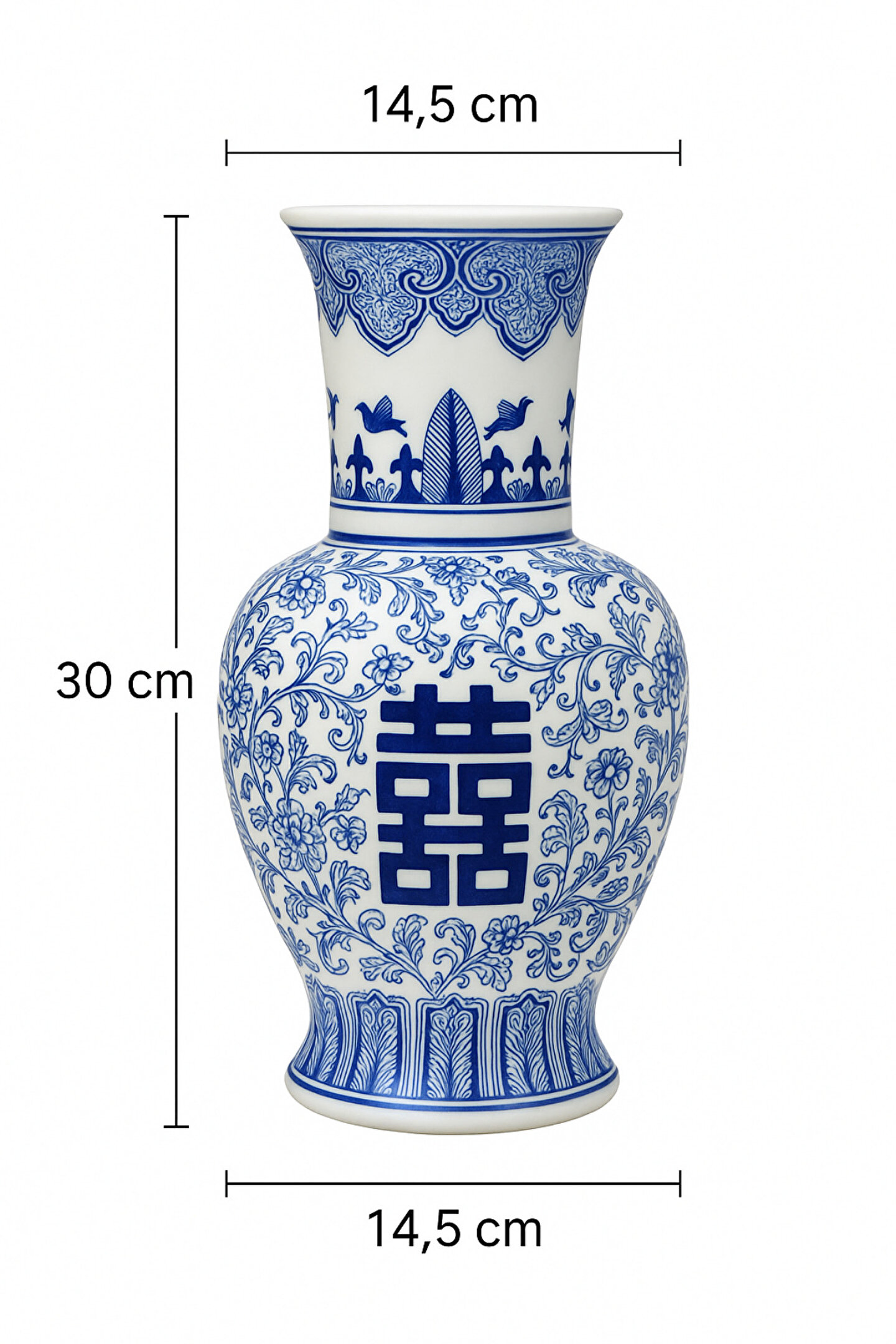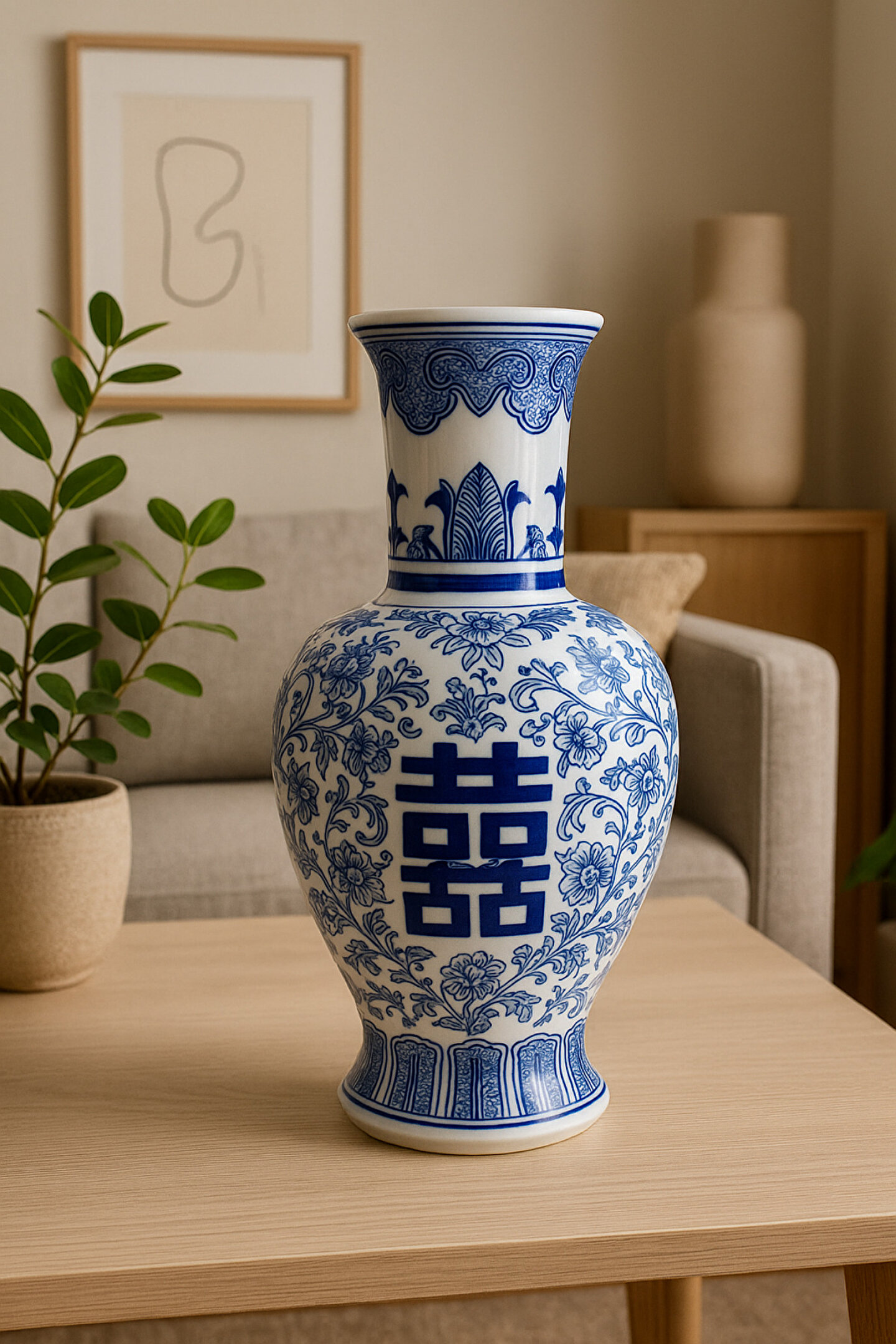 mavi-beyaz desenli porselen vazo, ince işçiliği ve zarif tasarımıyla her mekâna değer katıyor.
