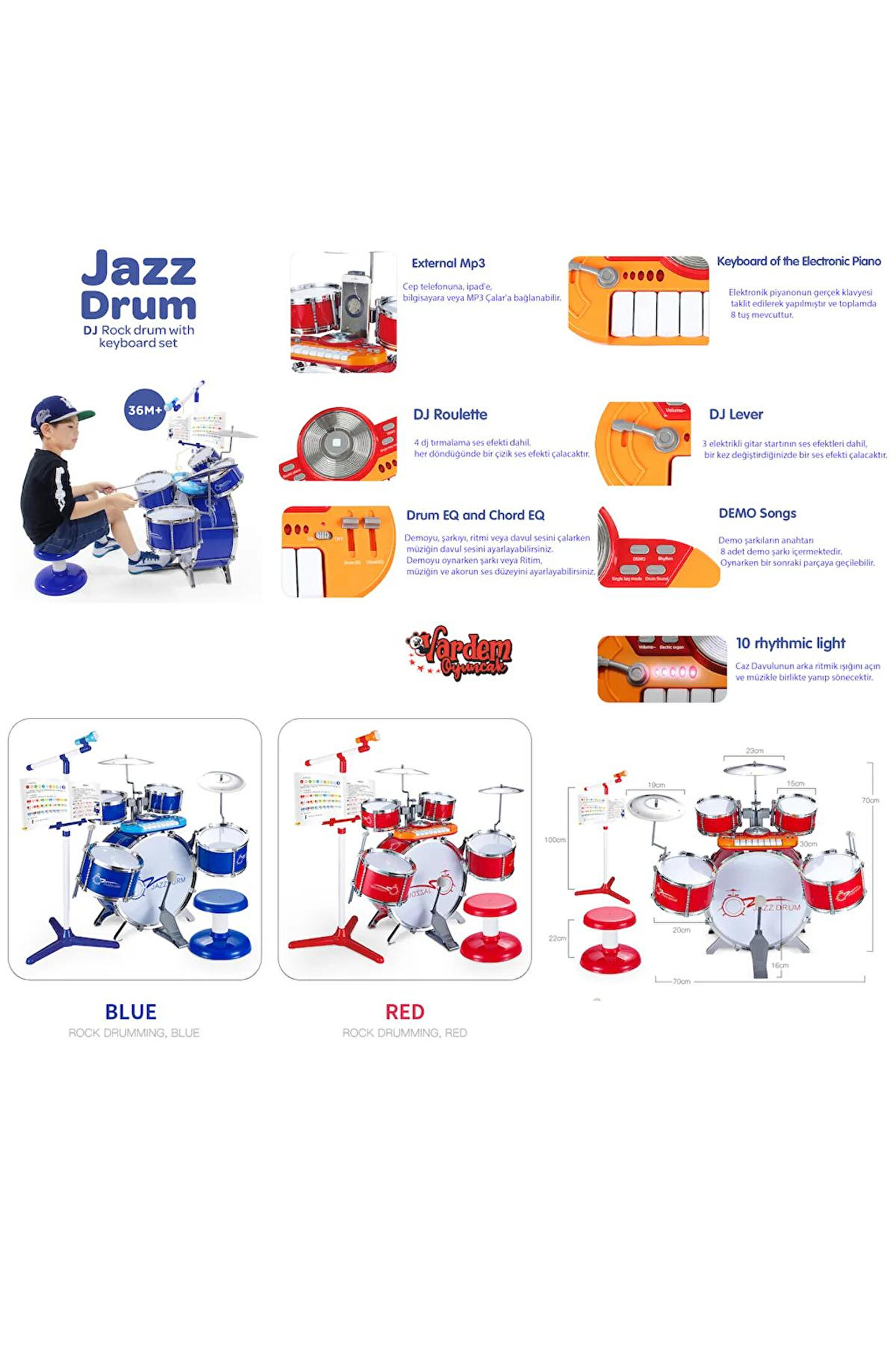 Eğitici mikrofon ve mp3 çalar: Çocuklar, kendi seslerini keşfetmeleri için eğitici mikrofon ve mp3 çalar ile interaktif bir deneyim yaşarlar. ; Bateri ve caz davul seti: Ritim duygusunu geliştirmek isteyen çocuklar için tasarlanmış bateri ve caz davul seti, minik müzisyenlere eğlenceli anlar sunar. ; Eğitim enstrüman klavye: Müzikal yetenekleri artırmak için klavye seti, çocuklara nota ve melodi öğrenme imkanı tanır. ; Renkli ve çekici tasarım: Renkli ve çekici tasarımı, çocukların ilgisini çeker ve müzikle eğlenmelerini sağlar. ; Öğretici modlar: Set, çocuklara temel müzik bilgisi ve ritim konularında eğitici modlar sunarak öğrenmeyi destekler. ; Dayanıklı ve güvenli malzemeler: Güvenlik standartlarına uygun olarak üretilmiş, dayanıklı ve çocuk dostu malzemeler kullanılmıştır. ; Küçük yaştan itibaren uygun: 3 yaş ve üzeri çocuklar için uygundur, bu da minik müzisyenlerin erken yaşlarda müzikle tanışmasını sağlar. ; Müzikal yetenek gelişimi: Set, çocukların müzikal yeteneklerini keşfetmelerine, geliştirmelerine ve keyifli bir şekilde öğrenmelerine yardımcı olur. ; Bu eğitici enstrüman seti, çocukların müzikle etkileşimde bulunarak hem eğlenmelerini hem de öğrenmelerini sağlar. ; Renkli tasarımı ve öğretici modlarıyla çocuklar, müzikal yeteneklerini geliştirmenin keyfini yaşarlar.;