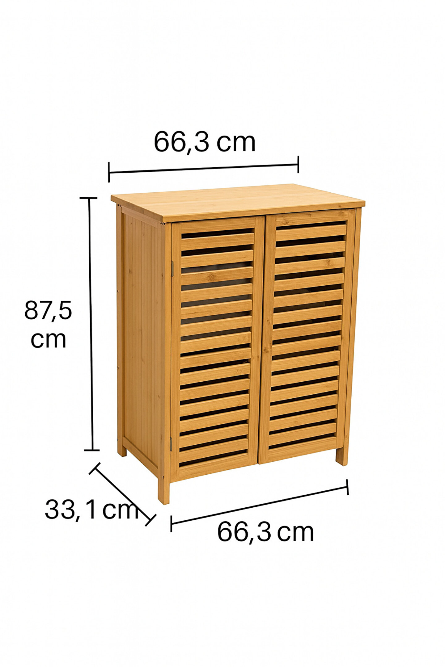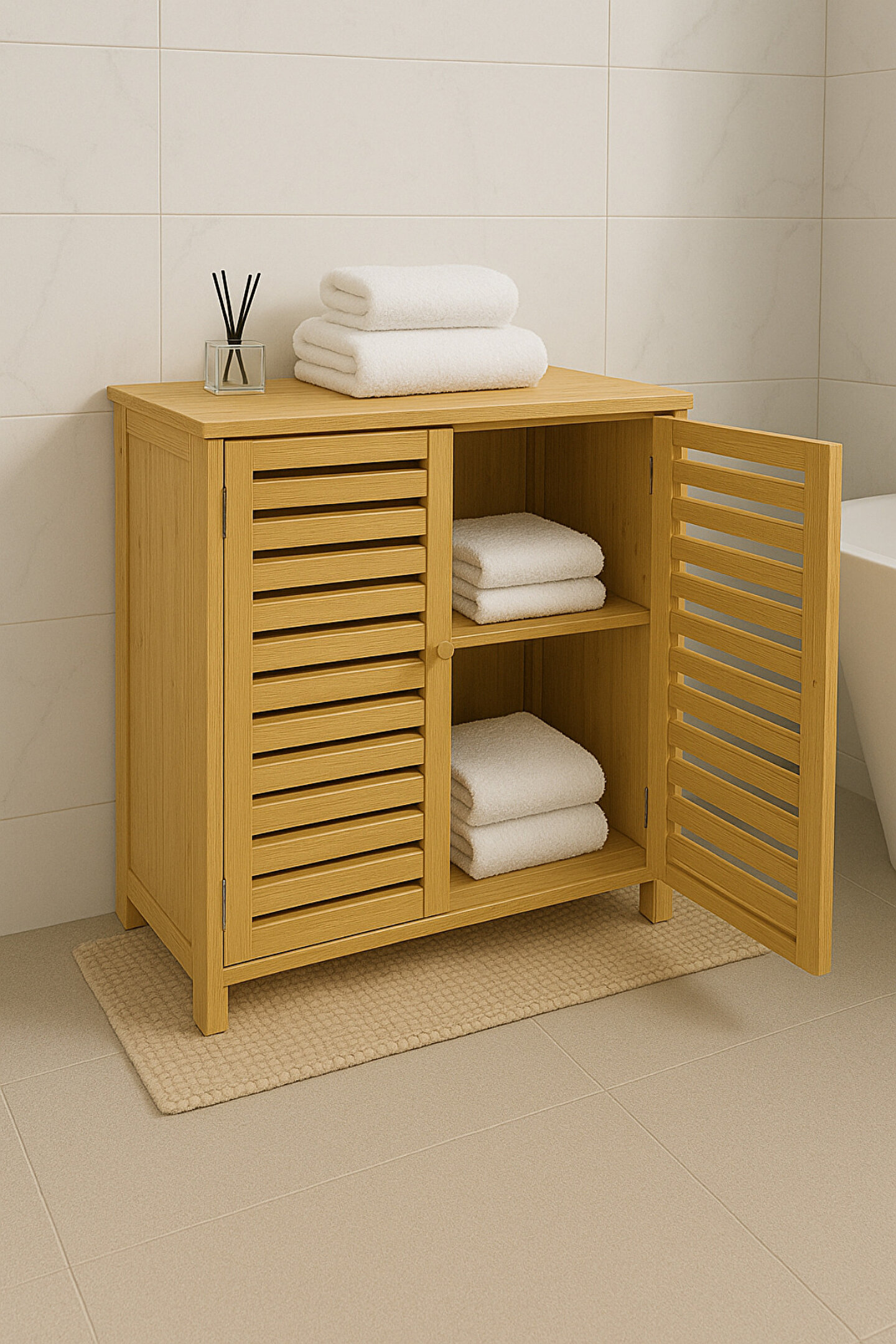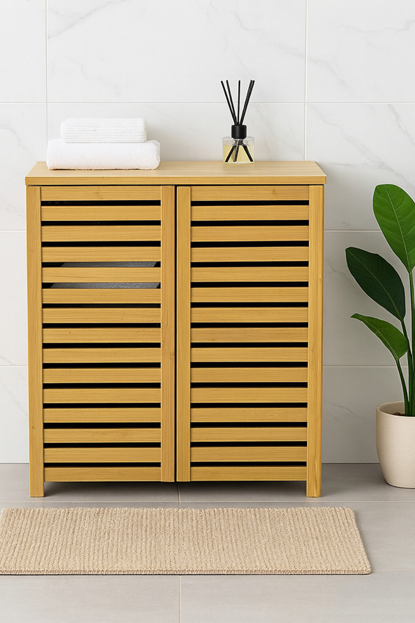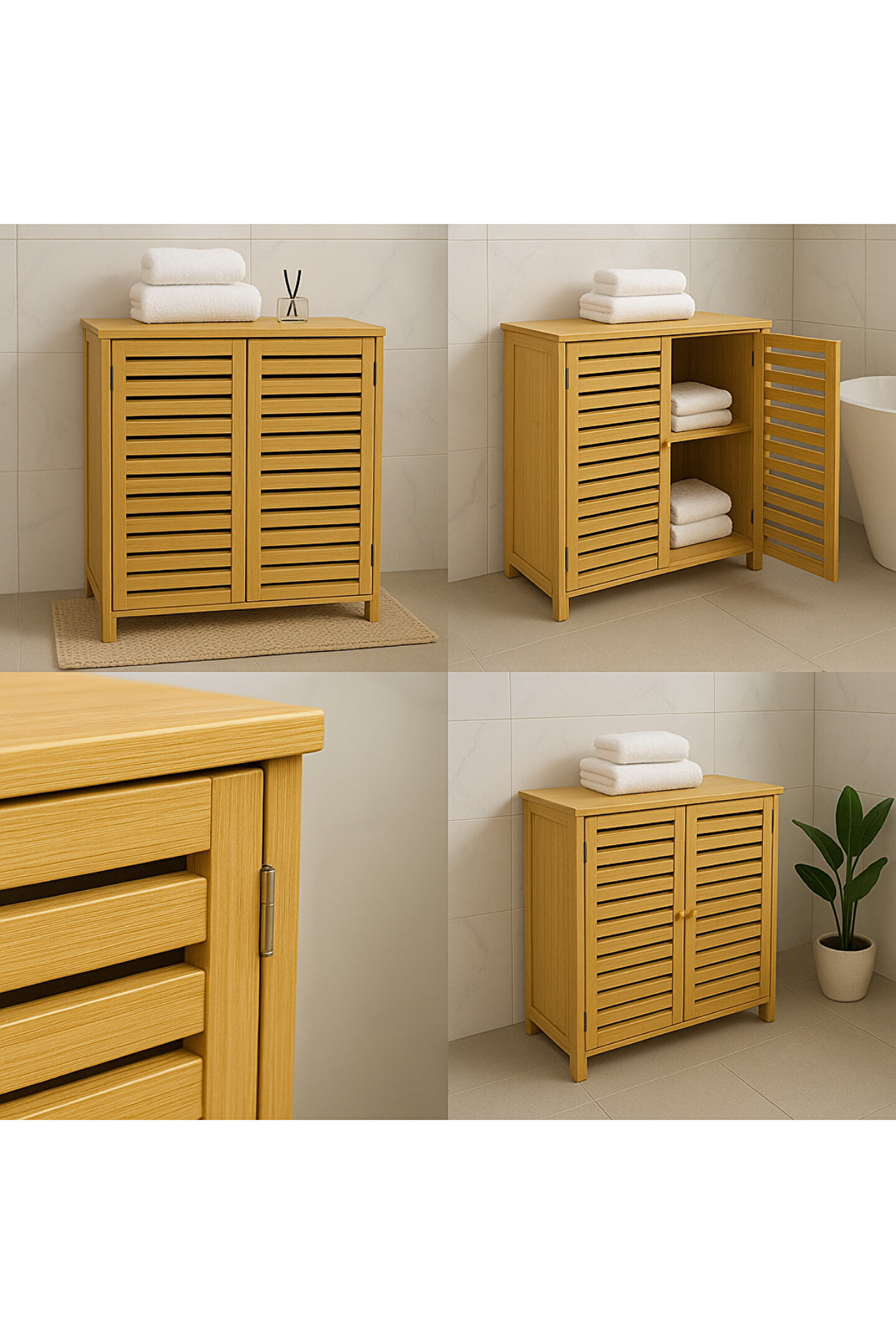 Doğal bambu dokusuyla balkon, banyo ve çamaşır alanlarına sıcak bir görünüm kazandıran Welcomein bambu dolap, panjur tasarımlı kapakları sayesinde hem şık hem de hava alan pratik bir saklama çözümü sunar.