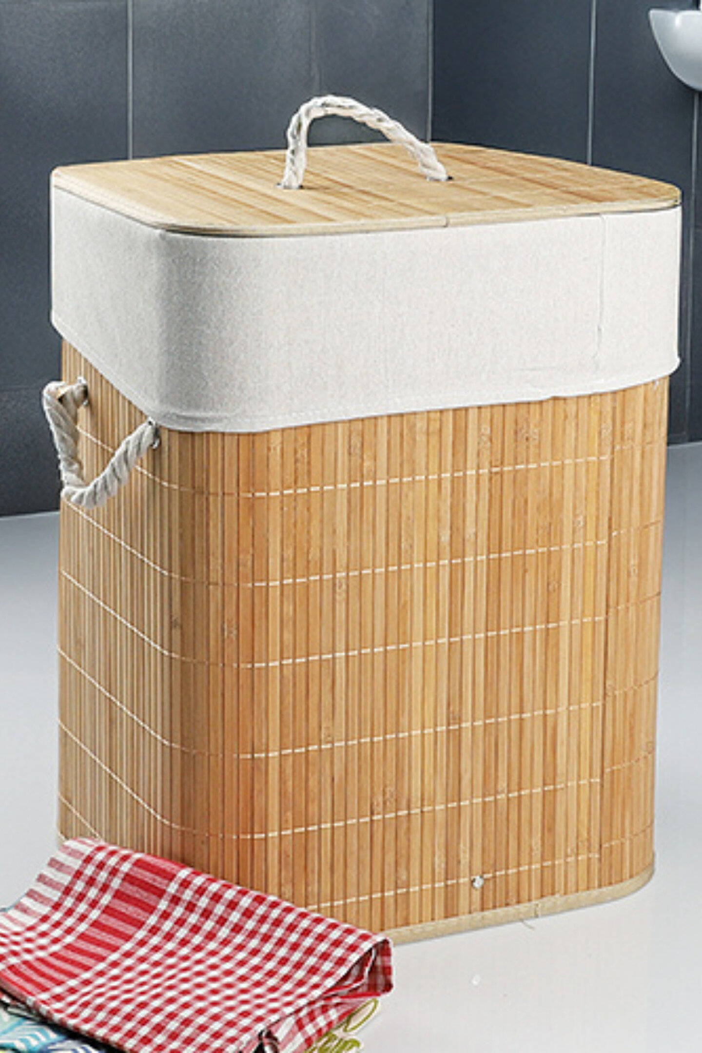welcomein Doğal Bambu Kapaklı Çamaşır Sepeti – Kapaklı, İpli Kulplu, Yıkanabilir İç Torbalı, 60 Lt.