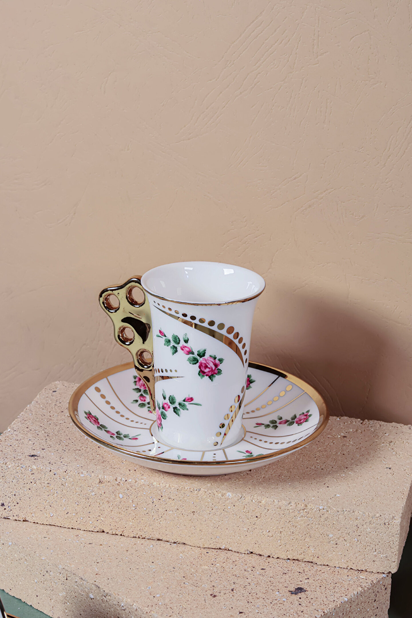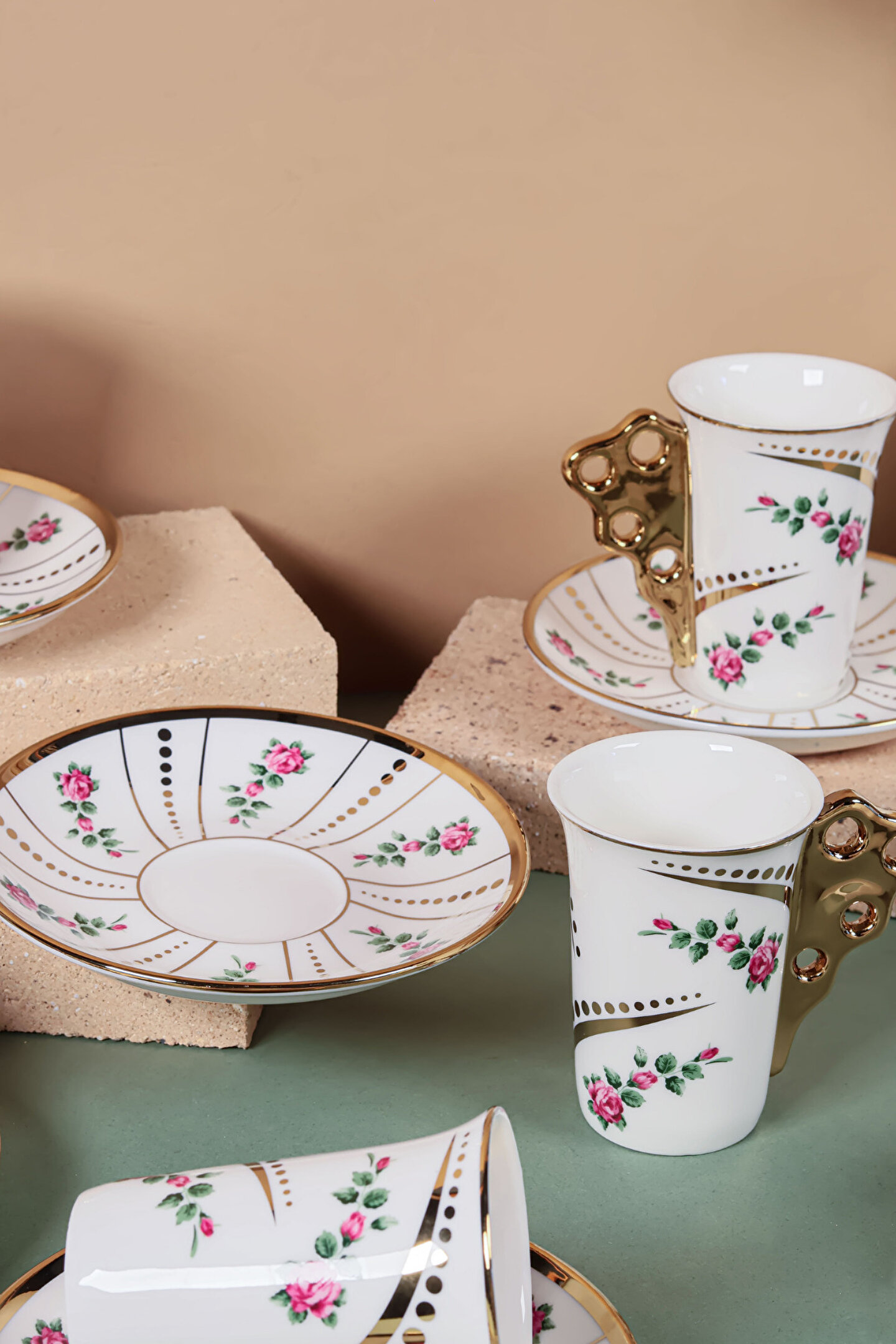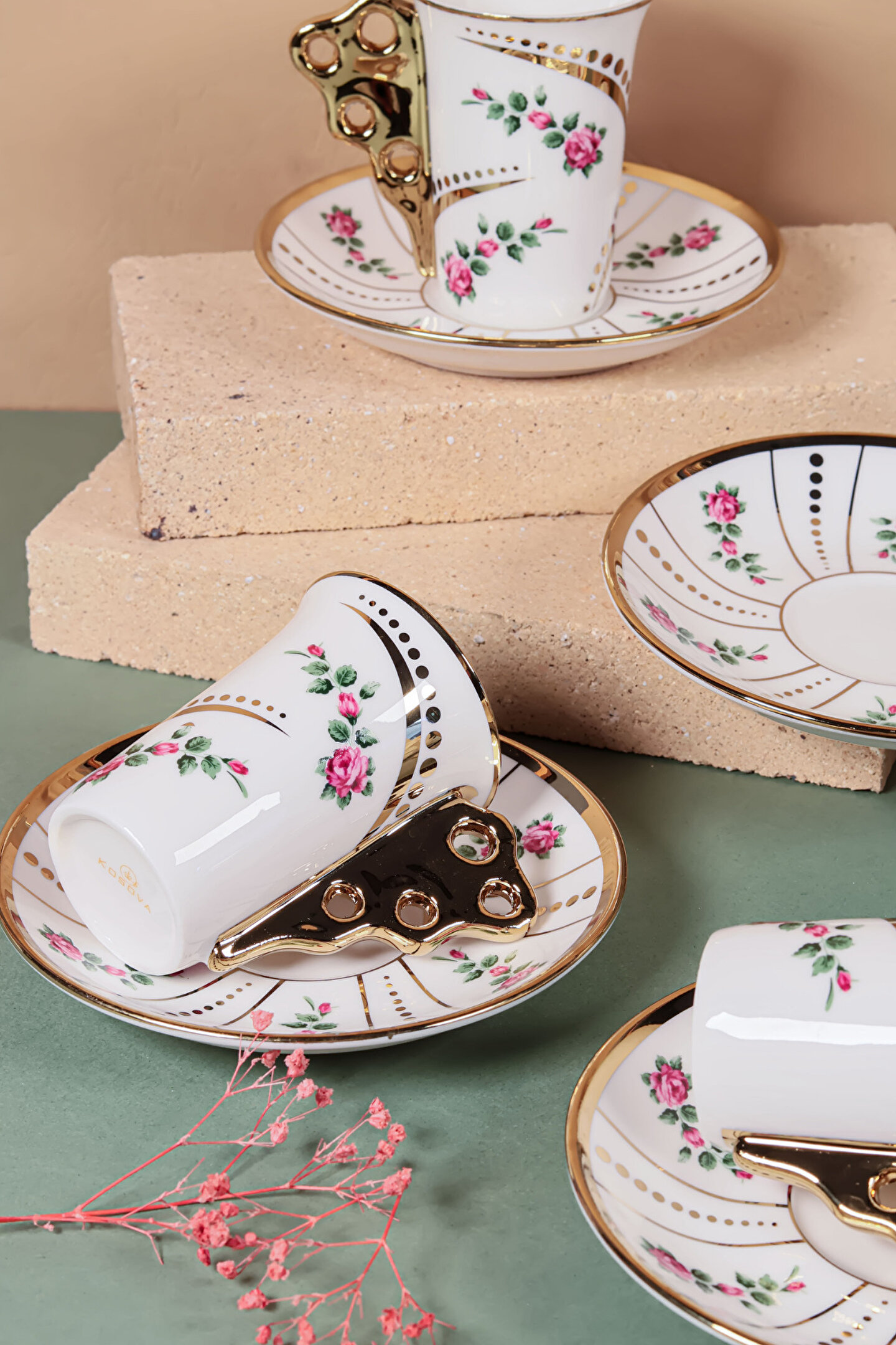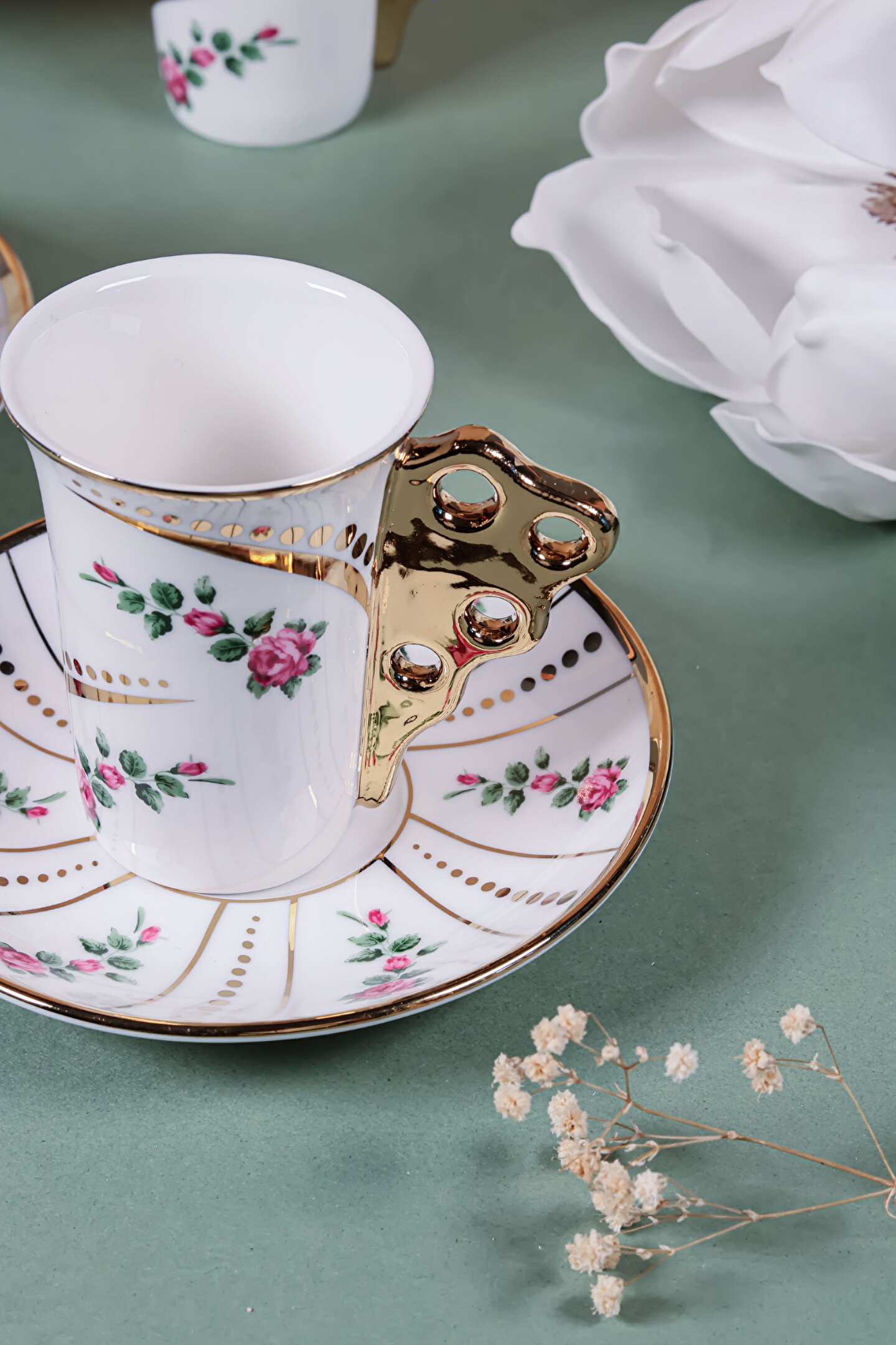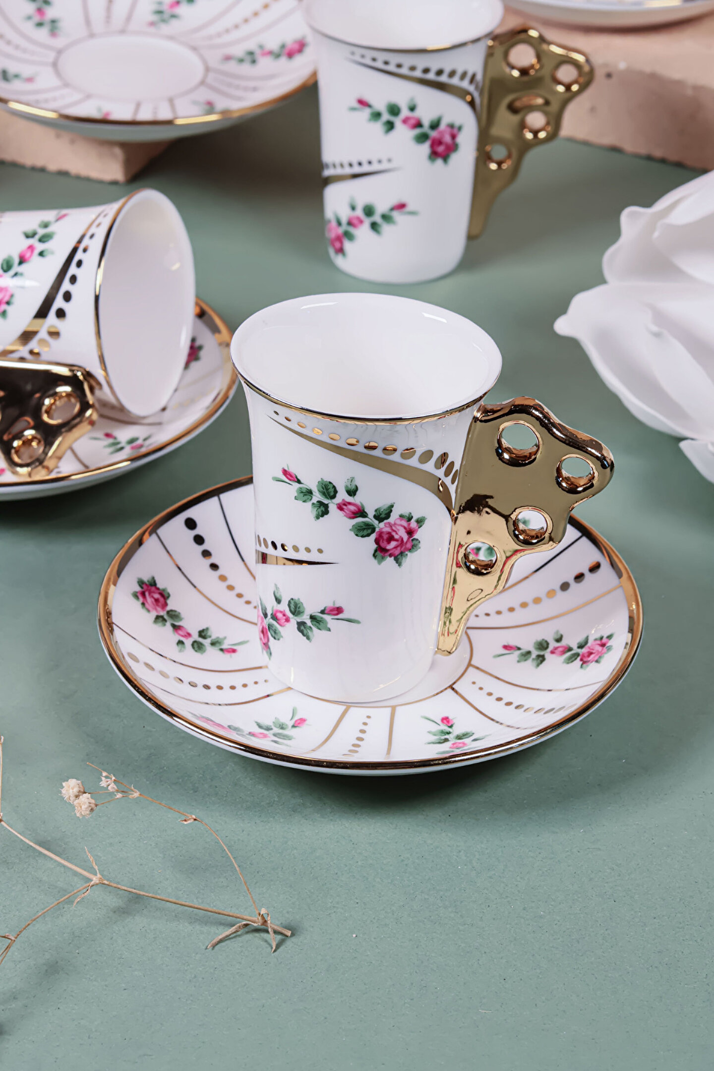 El işçiliği detaylarla süslenmiş bu özel fincan takımı, altın yaldızlı kulp tasarımı ve zarif çiçek desenleriyle sofralarınıza klasik bir ihtişam getiriyor.