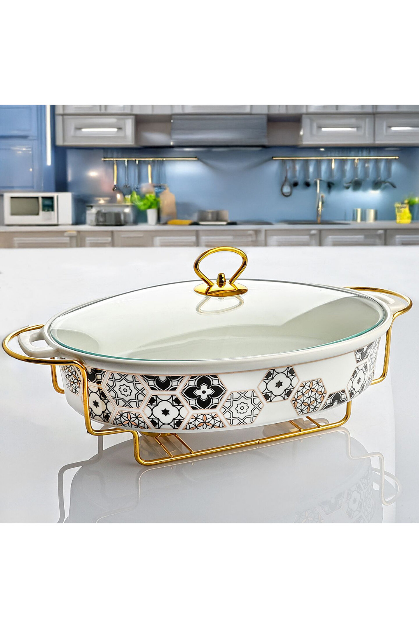 Gold Standlı Porselen Fırın Kabı, sofralarınızda hem kullanım kolaylığı hem de estetik sunum sağlar.