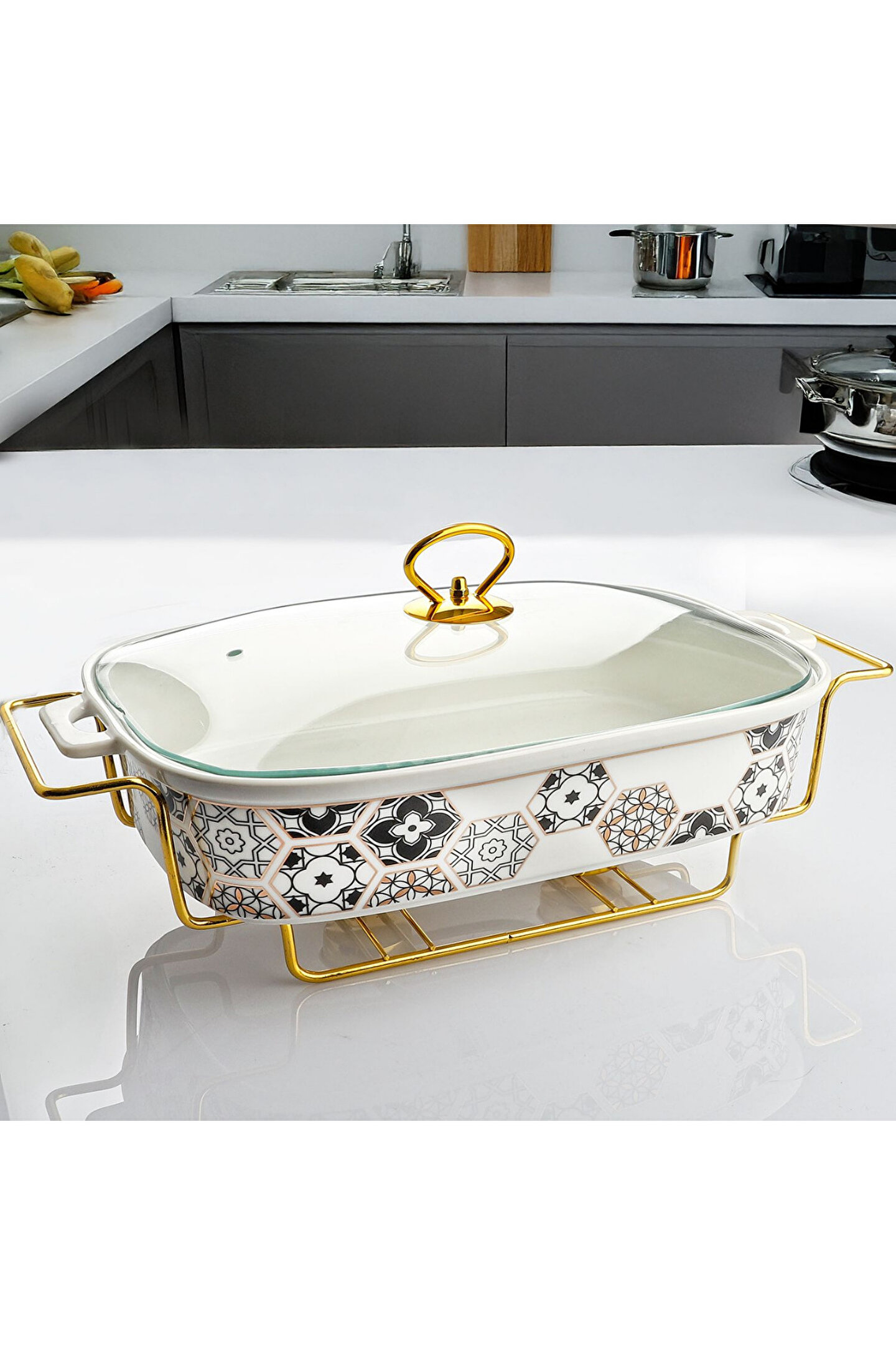 Yüksek ısıya dayanıklı premium porselen yapısı sayesinde yemekleriniz eşit ısıda pişer, cam kapağı ise pişirme ve servis sırasında hijyen sağlar. Gold metal standı ile masada güvenli ve şık bir duruş kazandırır.