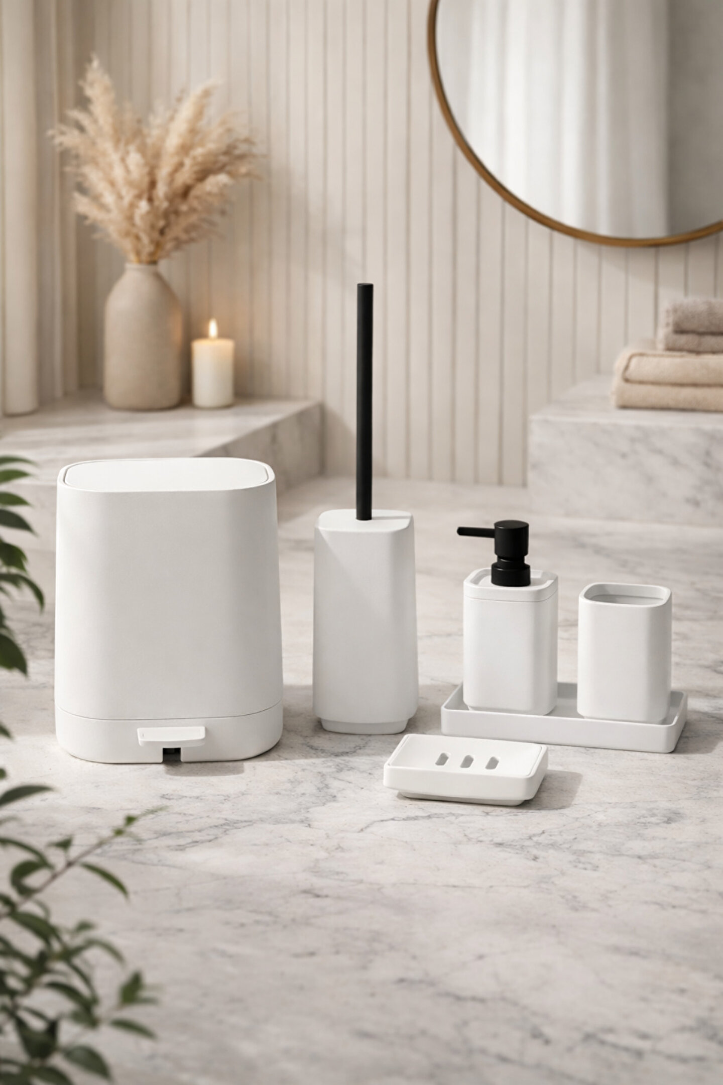 Takım halinde tam uyum: Kova, fırça, sabunluk ve fırçalık aynı renk ve formda, bütünlüklü görünüm sağlar.