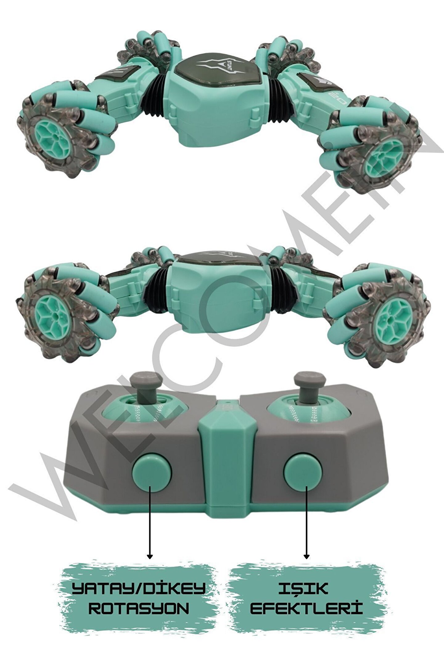 2; 4 GHz frekansında bir bilekten kumandalı ve bir uzaktan kumandalı olmak üzere 2 adet kumandaya sahiptir; Yatay gidebilen lastikleri sayesinde zorlu manevraları kolayca gerçekleştirebilir ve drift atabilir; Dikey hale gelebilen özelliği sayesinde eğlenceli ve heyecan verici sürüş deneyimi sunar; Tırmanma özelliği ile engelleri aşar; Güçlü led ışık efektleriyle donatılmıştır, hem gündüz hem de gece kullanımı için uygundur; Çocukların el; göz koordinasyonunun gelişmesine yardımcı olur; Çocuklar ve yetişkinler için eğlenceli ve dinamik bir sürüş deneyimi sunar; Kumandalar 2 adet ince(kumanda pili)pil ile çalışır; (piller dahil değildir);