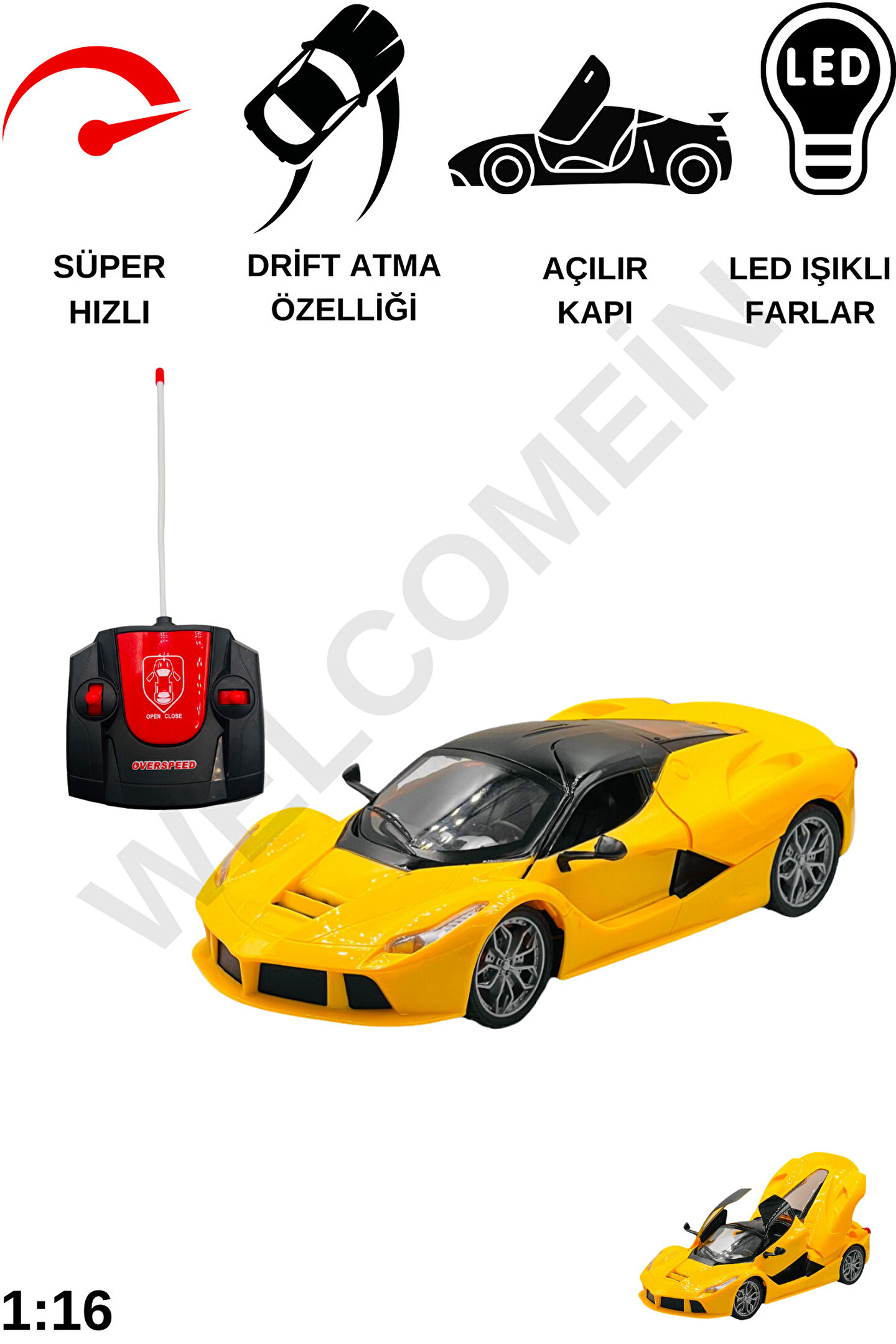 - Tam fonksiyonlu uzaktan kumandalı araba: İleri, geri, sağa, sola hareket etme ve drift atma özelliğine sahiptir. ; - Işıklı ön far: Araç, gerçekçi bir sürüş deneyimi sunmak için ön farlarıyla donatılmıştır. ; - Uzun kullanım süresi: 500 mAh bataryası sayesinde 30 dakikaya kadar kullanım süresi sağlar. ; - Hızlı şarj olma özelliği: 1 saat içinde tamamen şarj olabilir. ; - Kapı ve bagaj kontrolü: Uzaktan kumanda ile aracın kapılarını ve bagajını açıp kapatabilme özelliğine sahiptir. ; - Boyutlar: 11x27x7 cm boyutlarındadır.;