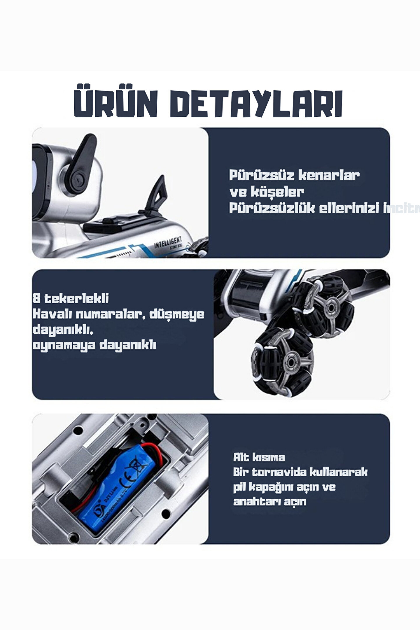 - Şarj edilebilir batarya ile uzun süreli oyun keyfi sunar.; - 3 yaş ve üzeri çocuklar için ideal bir oyuncak seçeneği olup, onların motor becerilerini geliştirmelerine yardımcı olur.; - Çılgın akrobat hareketleriyle çocukların eğlenceli vakit geçirmesini sağlar.; - Kolay kullanım için bilekten kontrol edilebilen uzaktan kumanda özelliği ile çocukların oyun deneyimini artırır.; - Piller kutu içeriğinde yer aldığı için ekstra pil ihtiyacını ortadan kaldırır ve hemen oyun keyfine başlamayı mümkün kılar.; - CN menşeili olup, Çin ana karasında üretilmiştir.;