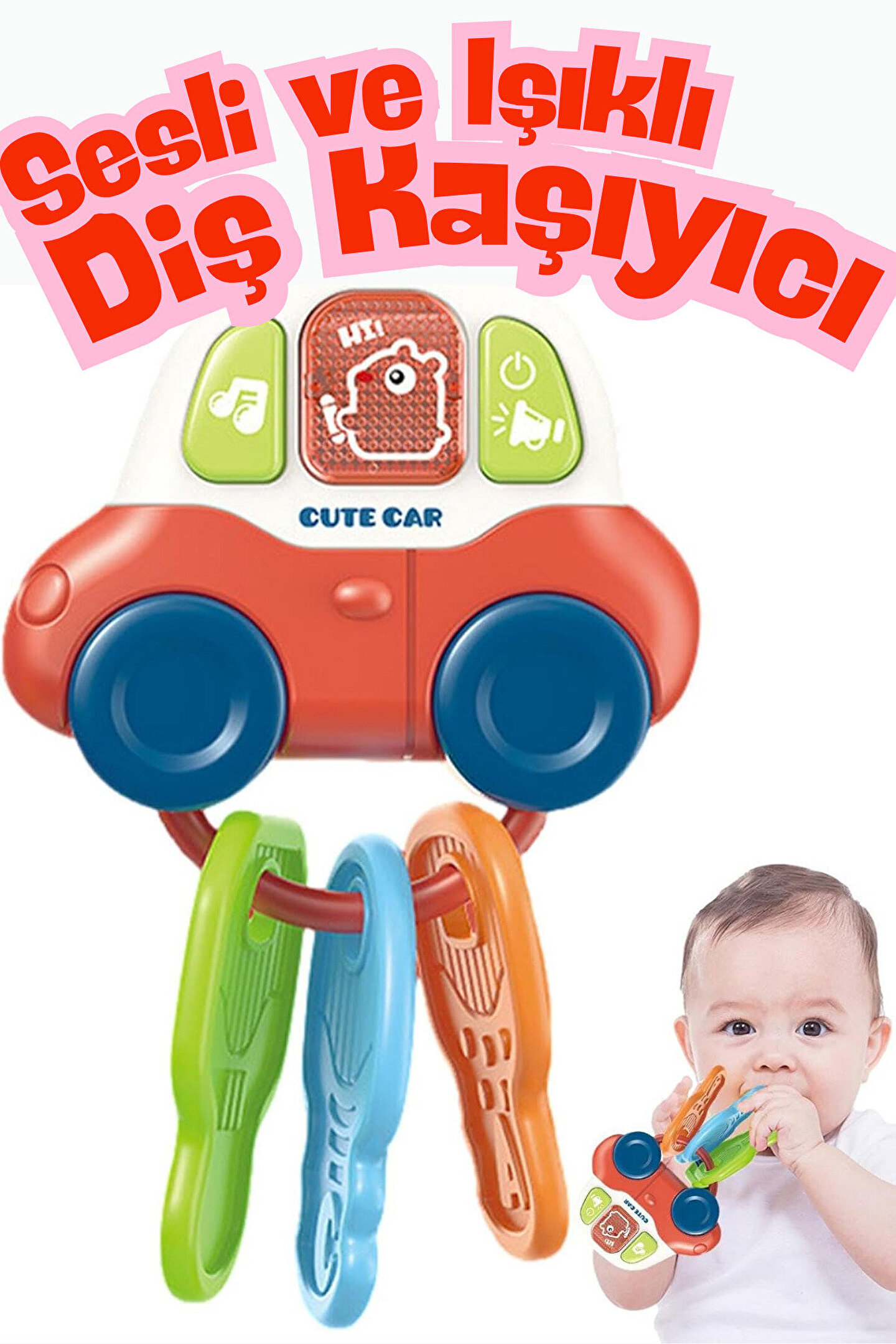 Oyuncak Sesli Işıklı Anahtarlıklı Bebek Arabası Diş Kaşıyıcılı Aktivite Oyuncağı +0 Yaş (Pil )