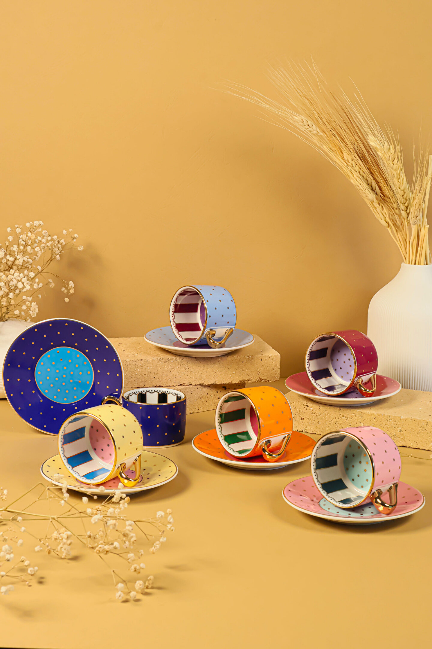 Enerjik renkler, altın ışıltısı ve modern çizgiler bir arada! Yeni koleksiyona ait bu porselen kahve fincan takımı, canlı renk paleti ve gold detaylı zarif tasarımıyla dikkat çekiyor.
