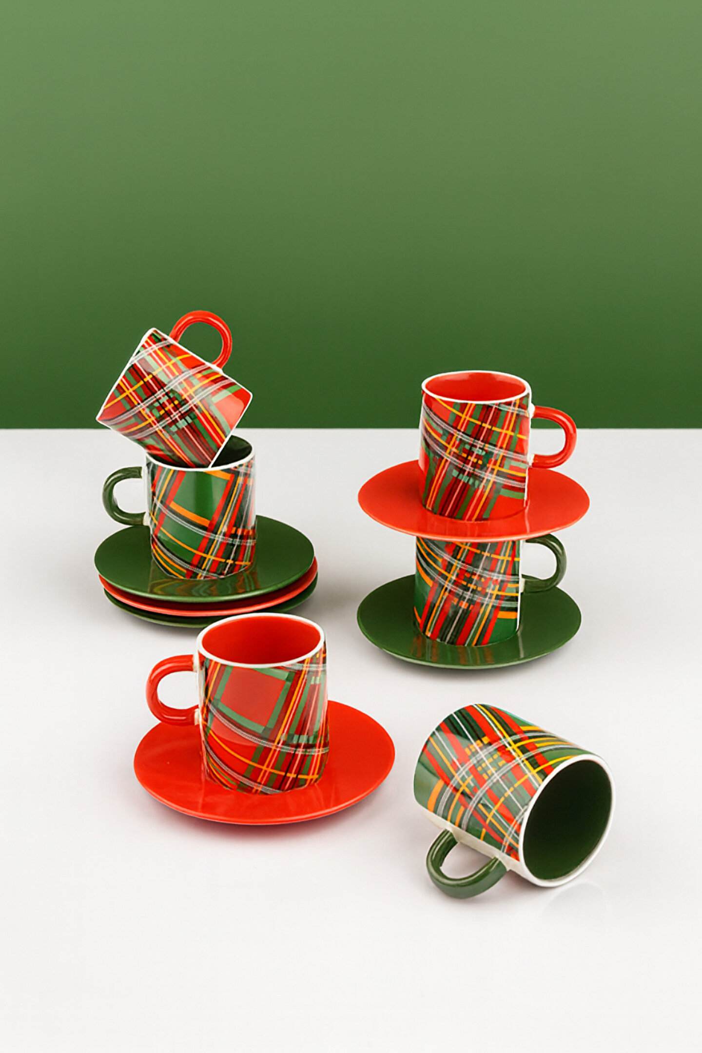 welcomein Yılbaşı Konseptli 6’lı Kahve Fincan Takımı – Kırmızı Yeşil Ekose Desenli, Porselen, Hediye Seti
