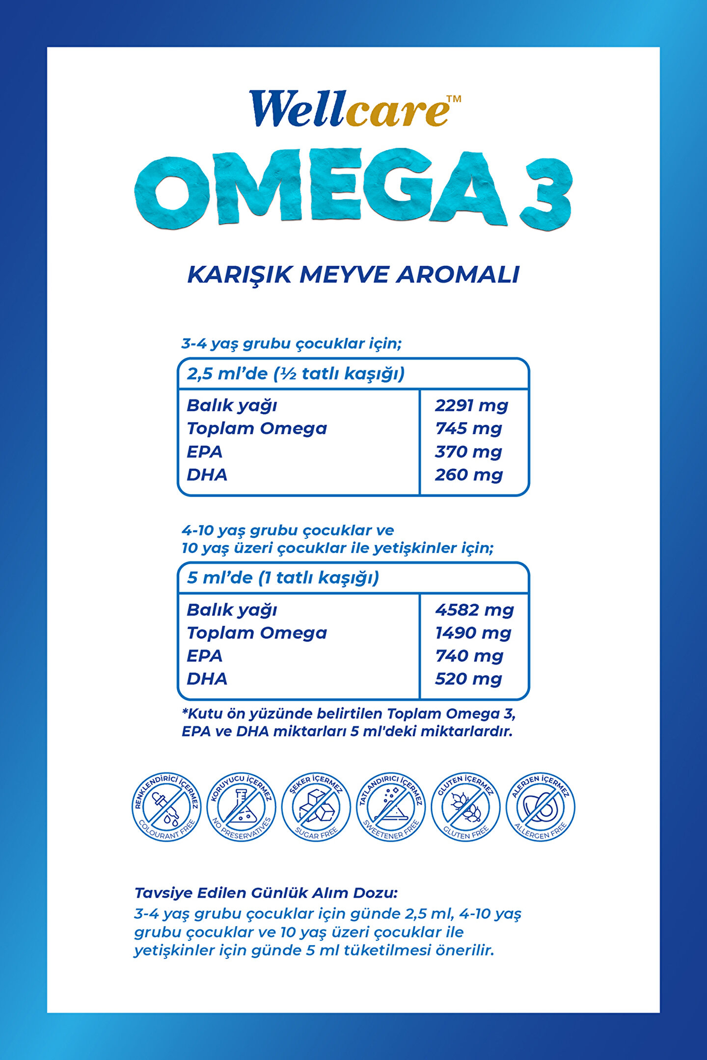 Wellcare Omega 3 Karışık Meyve Aromalı Balık Yağı;• Trigliserid formda yüksek Omega 3 içeren Wellcare Omega 3 koruyucu, tatlandırıcı, şeker, renklendirici, gluten içermez.;• EPA ve DHA kalbin normal fonksiyonuna katkıda bulunur. Faydalı etkinin sağlanabilmesi için günde 250 mg EPA ve DHA alınmalıdır.;• DHA normal beyin fonksiyonlarının ve normal görme yetisinin korunmasına katkıda bulunur.Faydalı etkinin sağlanabilmesi için günde 250 mg DHA alınmalıdır.;• Dokosahekzaenoik asit (DHA)’in anne tarafından alınması fetusun ve emzirilen bebeklerin normal beyin ve normal göz gelişimine katkıda bulunur. Hamile ya da emziren kadınlar da faydalı etki, omega-3 yağ asitlerinin yetişkinler için önerilen günlük alım miktarlarına ek olarak 200 mg DHA alındığında sağlanmaktadır.; Kullanım Önerisi;3-4 yaş grubu çocuklar için günde 2,5 ml, 4-10 yaş grubu çocuklar ve yetişkinler için günde 5 ml tüketilmesi önerilir