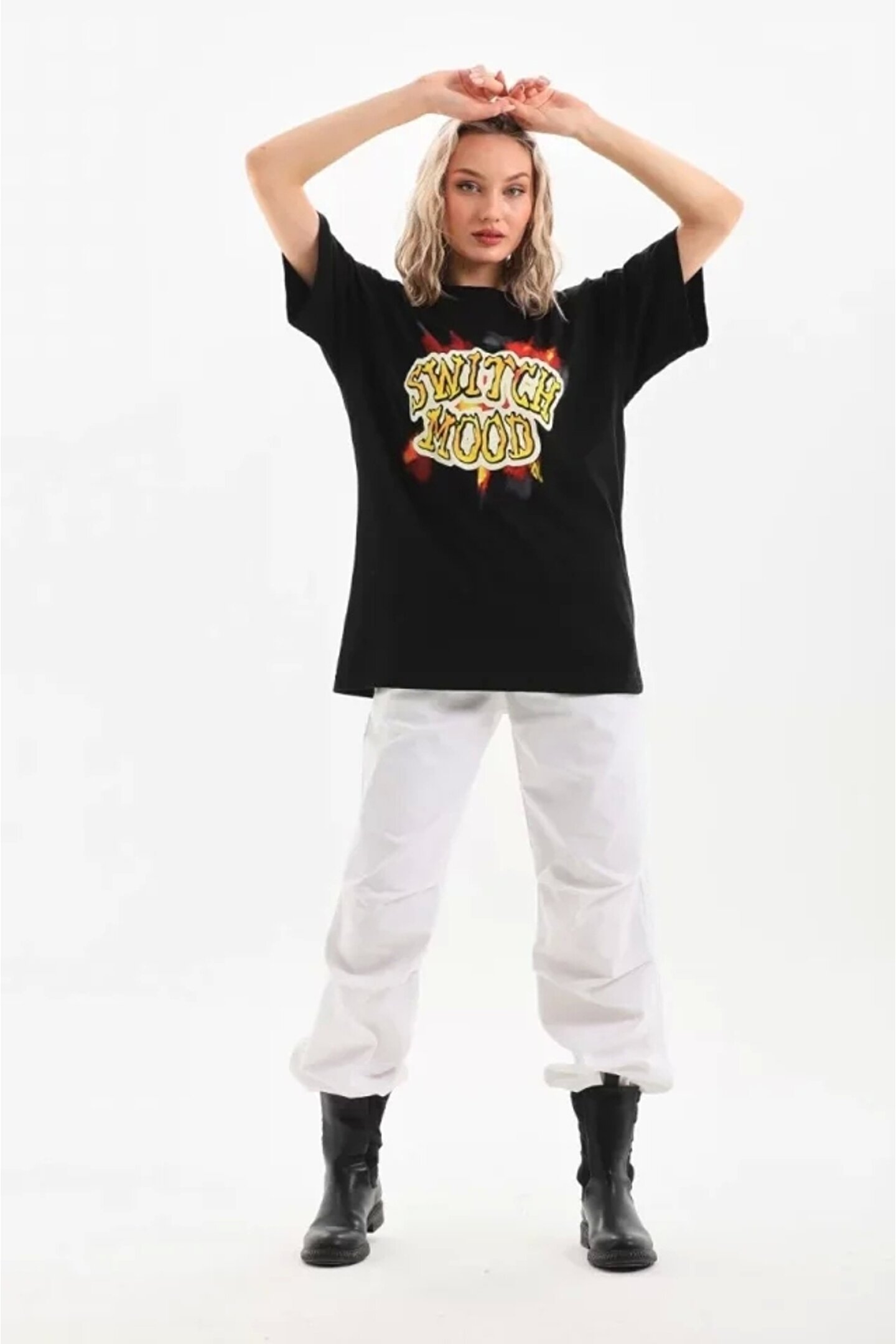 Unisex Baskılı Oversize T-Shirt - Siyah Modelin Ölçüleri: Boy:165, Kg:55, Göğüs:90, Bel:72, Kalça: 100 Modelin üzerindeki ürün M/38 bedendir