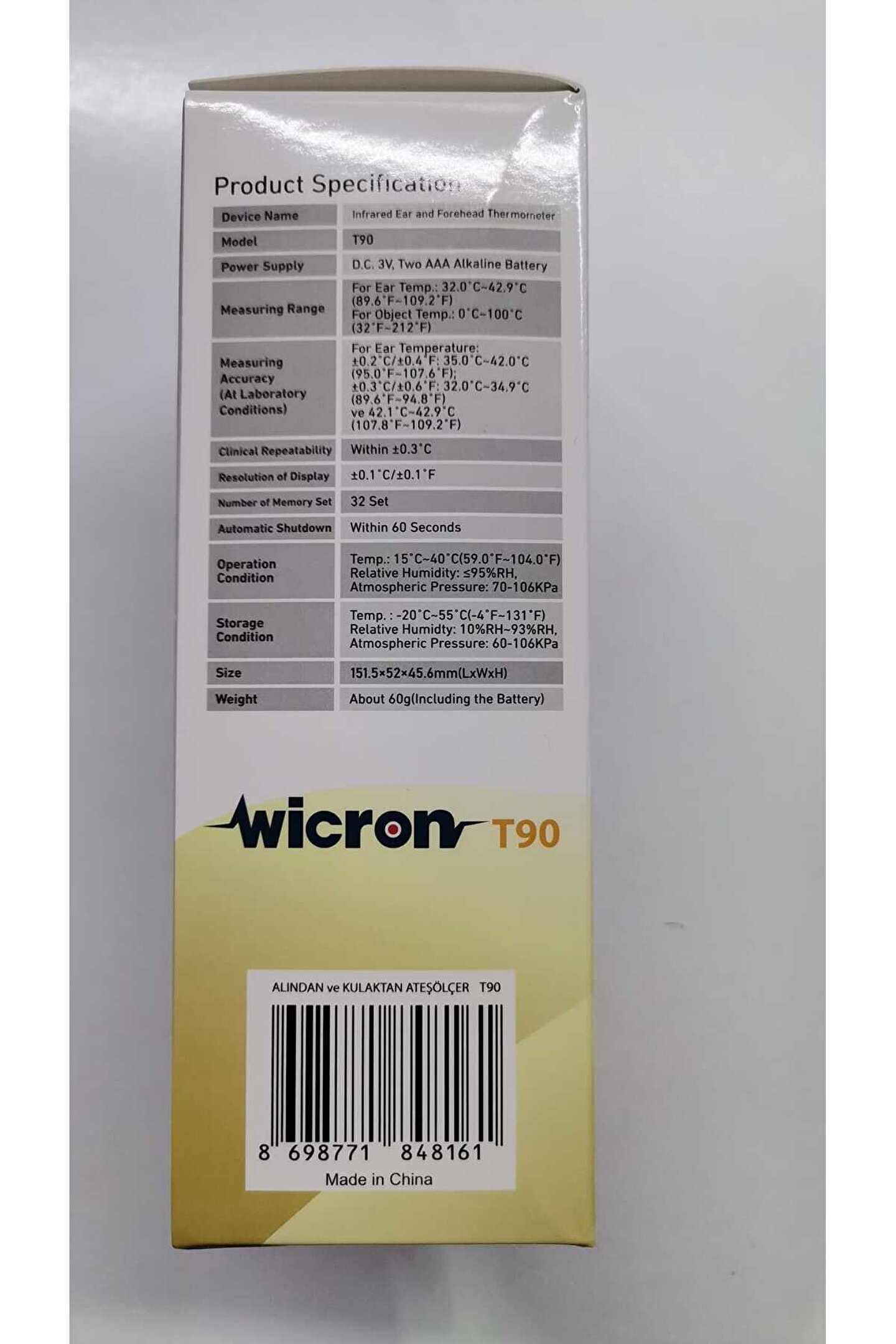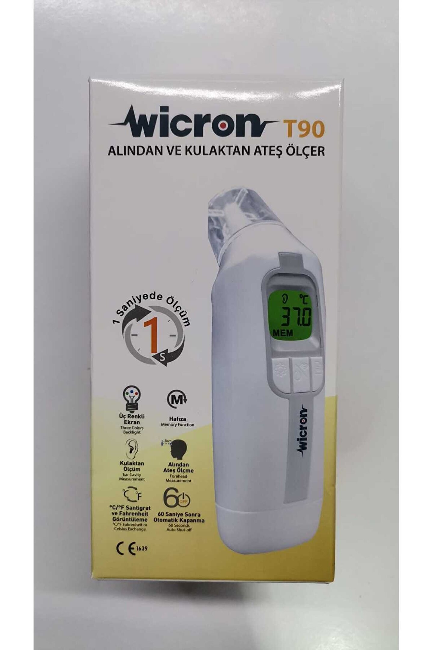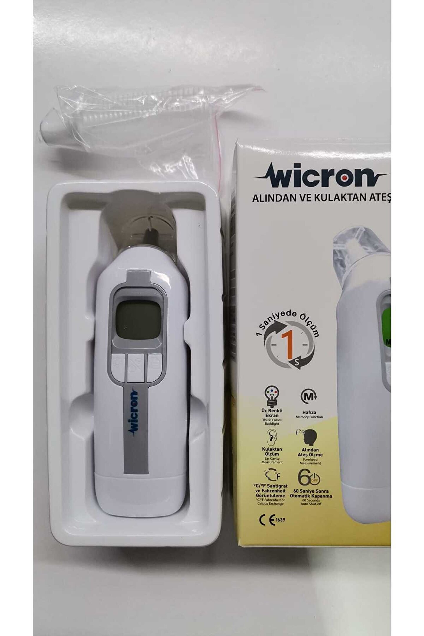 1-Wicron alından ve kulaktan ateş ölçer termometre 2-3 renkli ekran 3-32 ölçüm belleği 4-Kulaktan ve alından ölçüm(25 adet kulaktan ölçme aparatı) 5-60 sn.; Otomatik kapanma