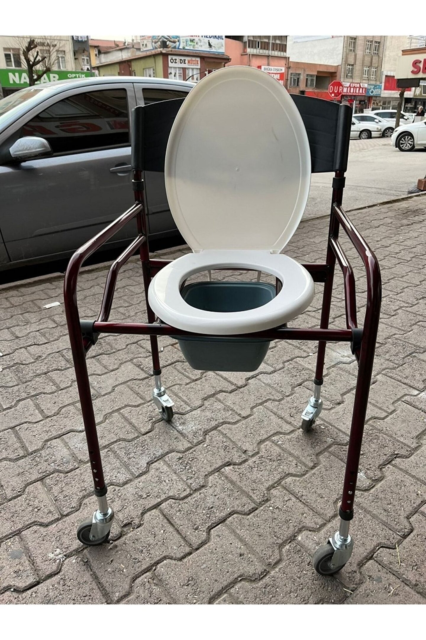 Medikaltec Plastik Kapaklı Tekerlekli Tuvaletli Hasta Sandalyesi Tekerlekli Tuvaletli yükseklik ayarlı 2si frenli 4 tekerlekli kovası 120 kg aşıma kapasitesi; 45 cm iç genişlik KATLANABİLİİR;