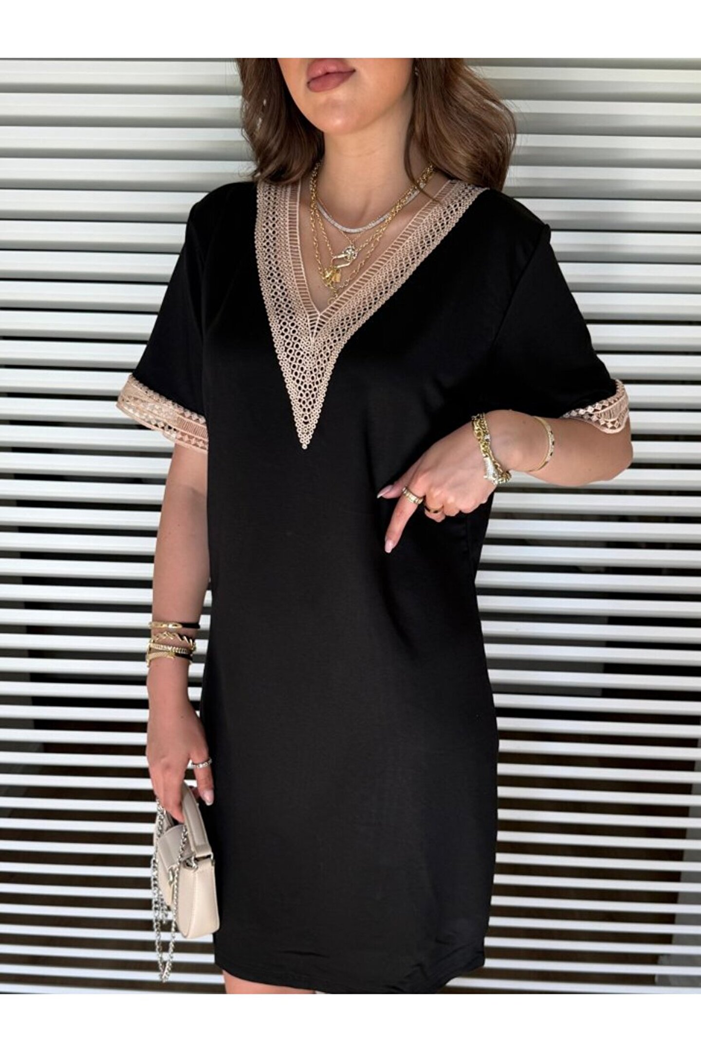 Kadın V Yaka Güpürlü İki İplik Elbise