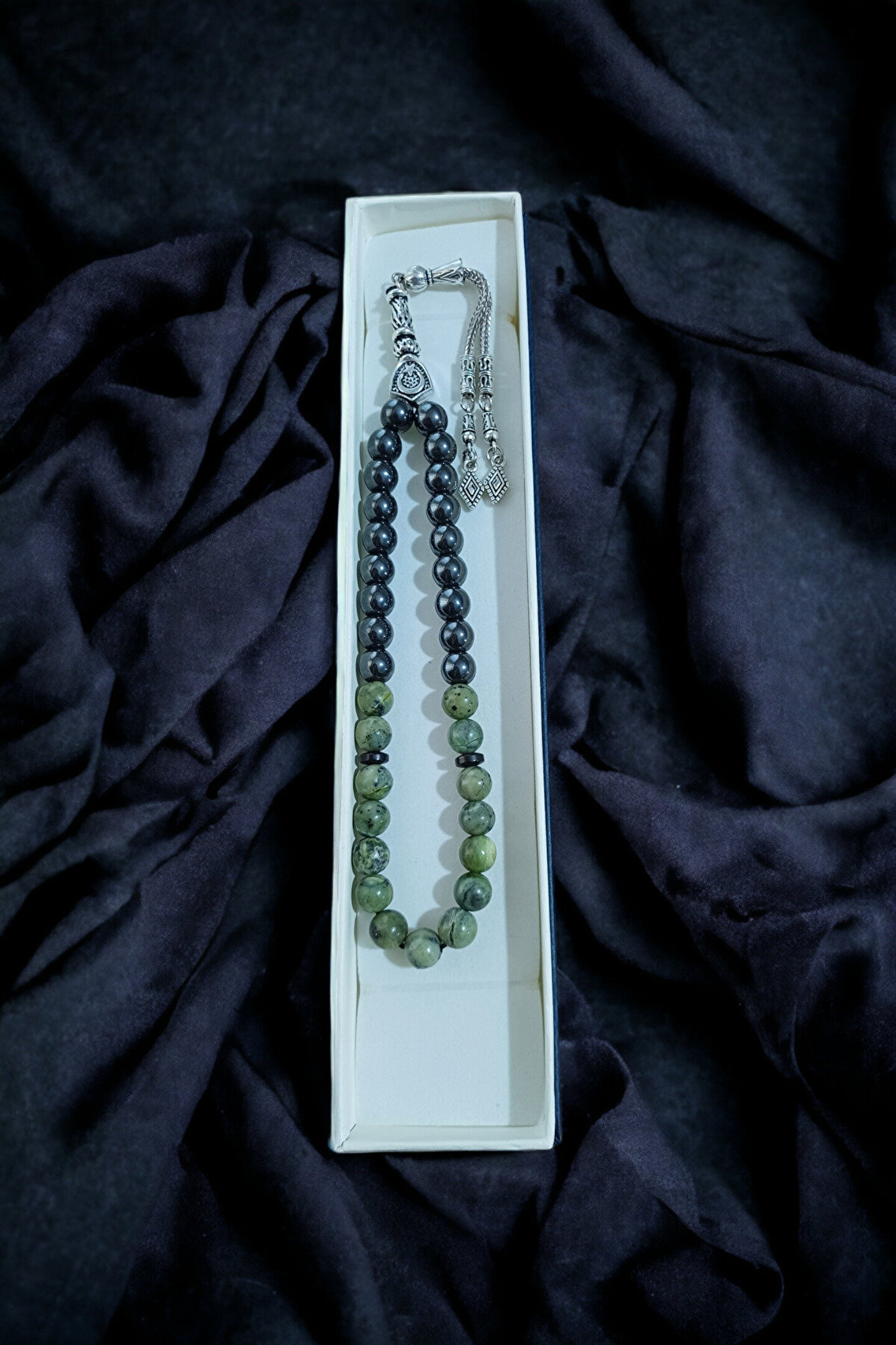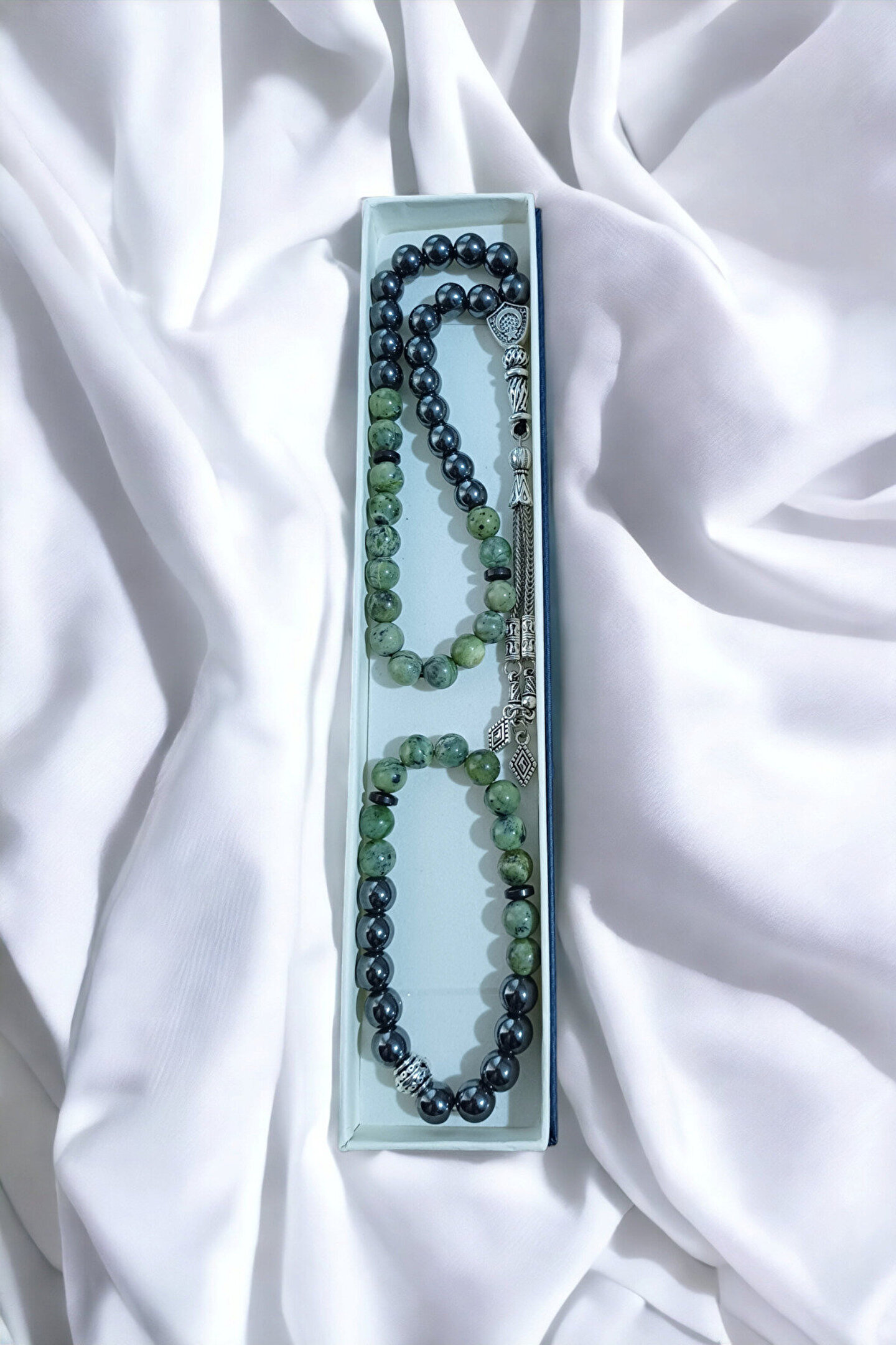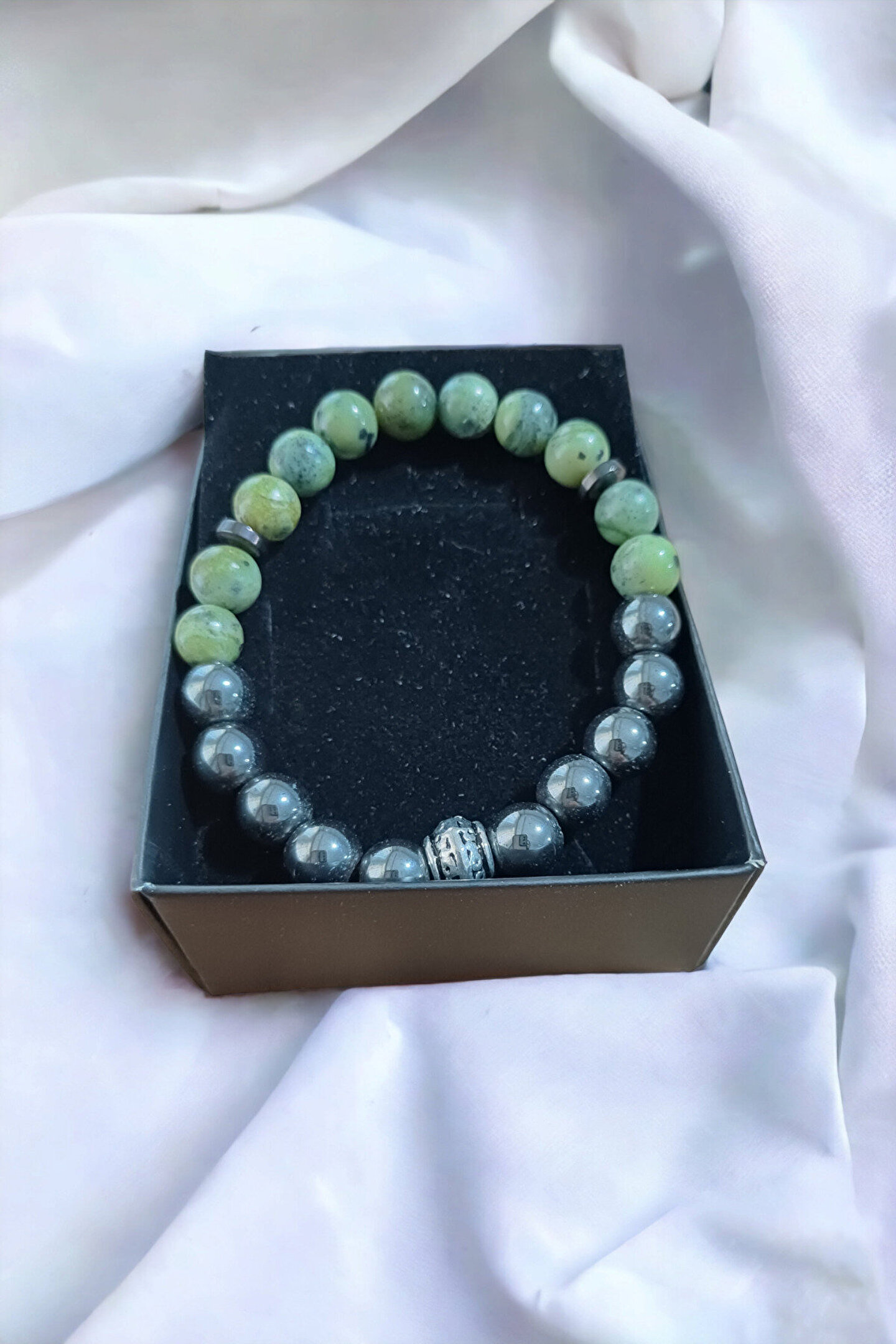 Doğal taş kullanımı sayesinde her bir bileklik, benzersiz ve otantik bir görünüm sunar; Yeşim taşı ve hematit gibi değerli taşların birleşimi, hem şıklığı hem de zarafeti bir arada barındırır; Genç yaş grubuna hitap eden tasarımıyla, modern ve trend bir aksesuar tercihi sunar;