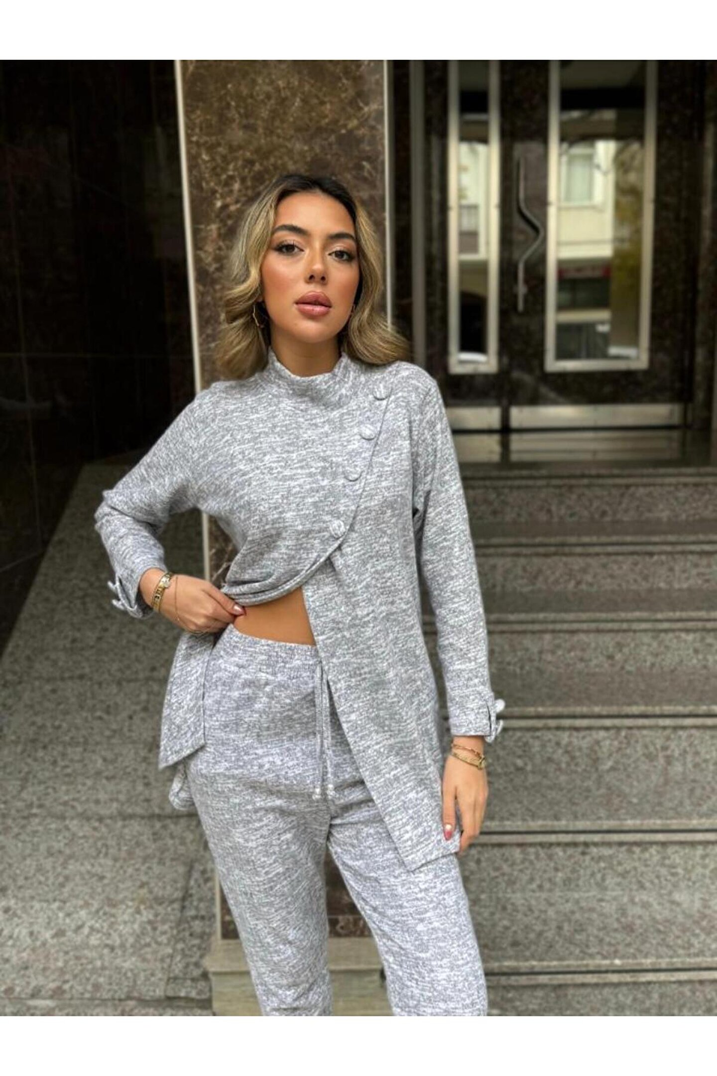 Kadın Uzun Kollu Balıkçı Yaka önden Düğmeli Bluz Ve Pantolon Yumoş Ikili Takım