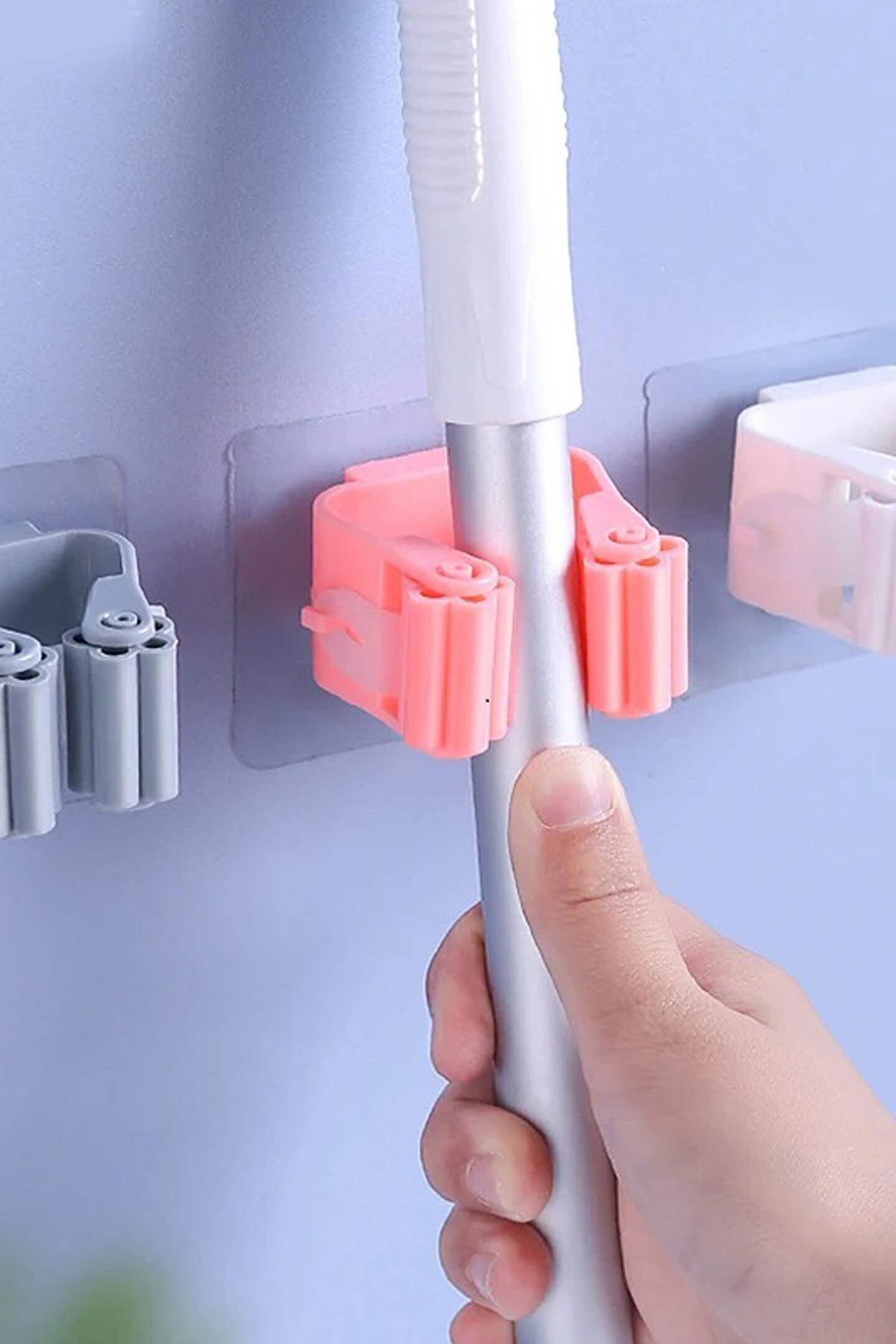 Süpürge, paspas, temizleme fırçası, şemsiye ve saplı diğer ürünleri asmak için kullanılabilir.; Banyonuzu temiz ve düzenli tutun, yerden tasarruf edin.; Kolayca düşmeden duvara yapışması kolaydır.; Kurulumu kolay: sadece kendinden yapışkanlı ped filmini soyun ve pürüzsüz duvar yüzeyine yapıştırın, ardından birkaç saniye basın.; Pürüzsüz ve kuru bir yüzeye yapıştırın.; Paket içeriği: 4 Adet Gri Renk Yapışkanlı Pratik Mop Tutucu