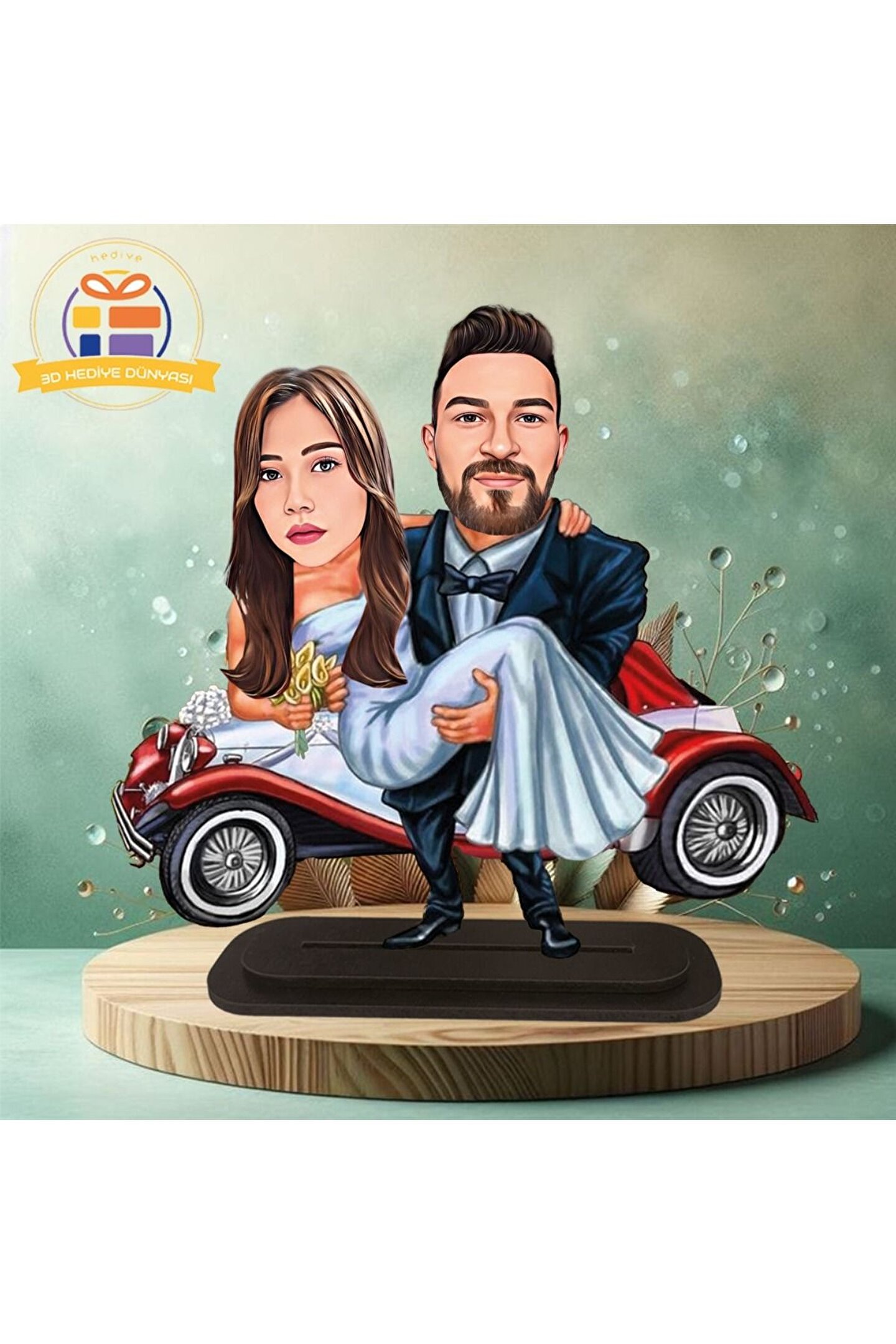 Nostalji arabalı gelin damat karikatürlü biblo hediye 3d masa üstü biblo hediyesi