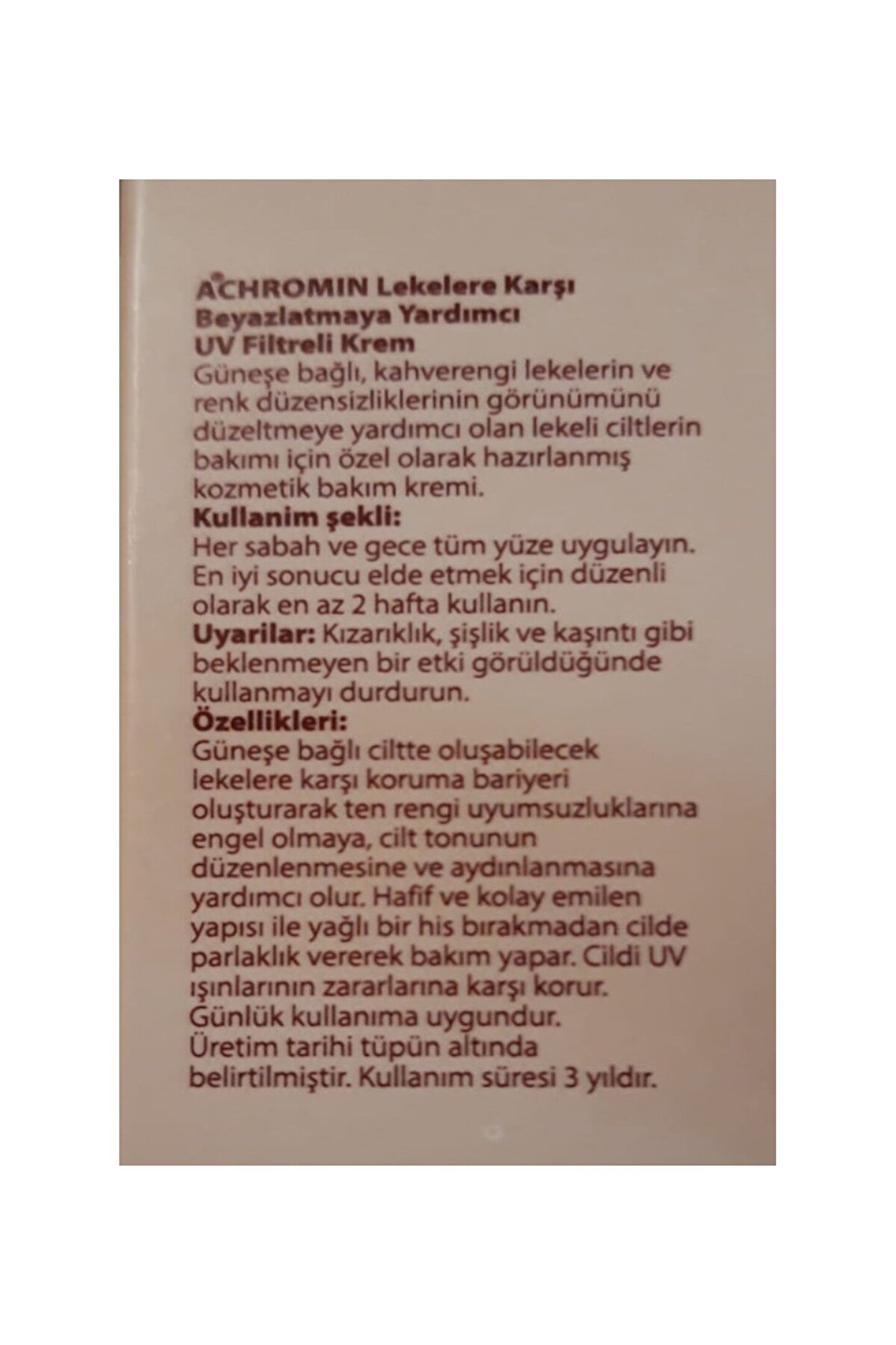 Lekelere karşı etkili bakım sunan bu krem, cilt tonunu eşitlemeye yardımcı olur ve lekelerin görünümünü azaltmaya destek verir; Krem formundaki yapısı ile kolay uygulanır ve cilde hızlıca nüfuz ederek etkin bir şekilde çalışır; Tüm cilt tipleri için uygun formülüyle herkes tarafından güvenle kullanılabilir; hassas ciltler dahil; Pratik tüp ambalajı sayesinde istediğiniz her an rahatça kullanabilirsiniz; seyahatlerde de yanınızda taşıyabilirsiniz;