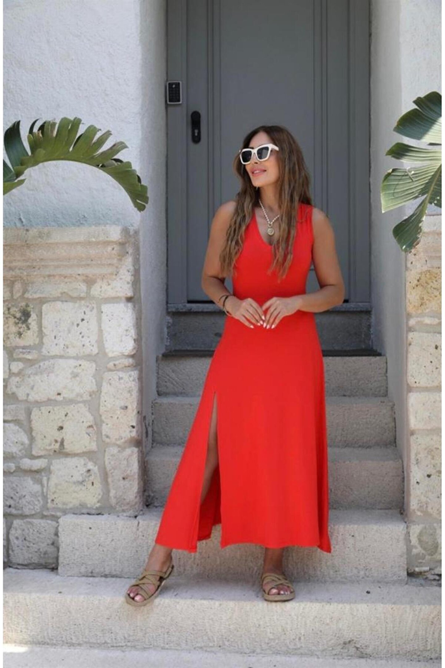 Adora Moda Kadın Askılı V Yakalı Yırtmaçlı Viskon Elbise