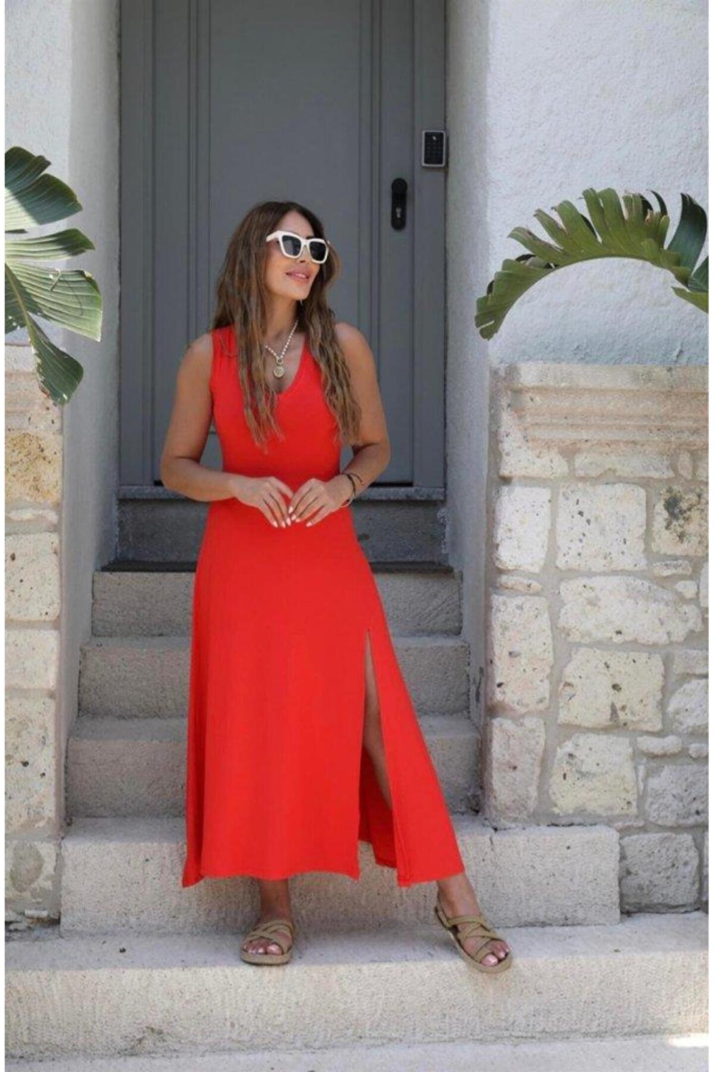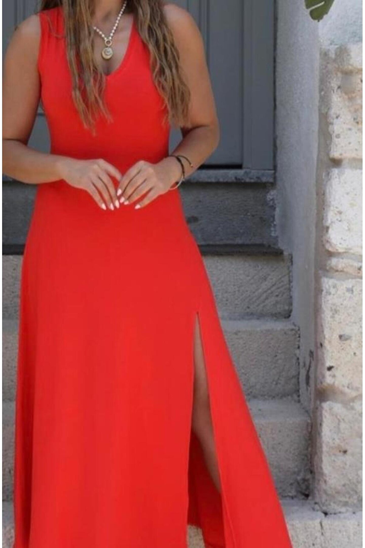 Adora Moda Kadın Askılı V Yakalı Yırtmaçlı Viskon Elbise